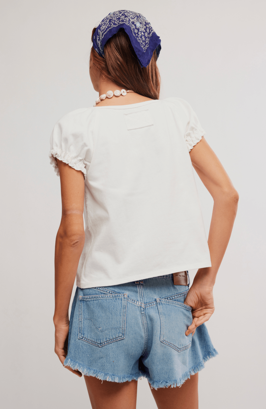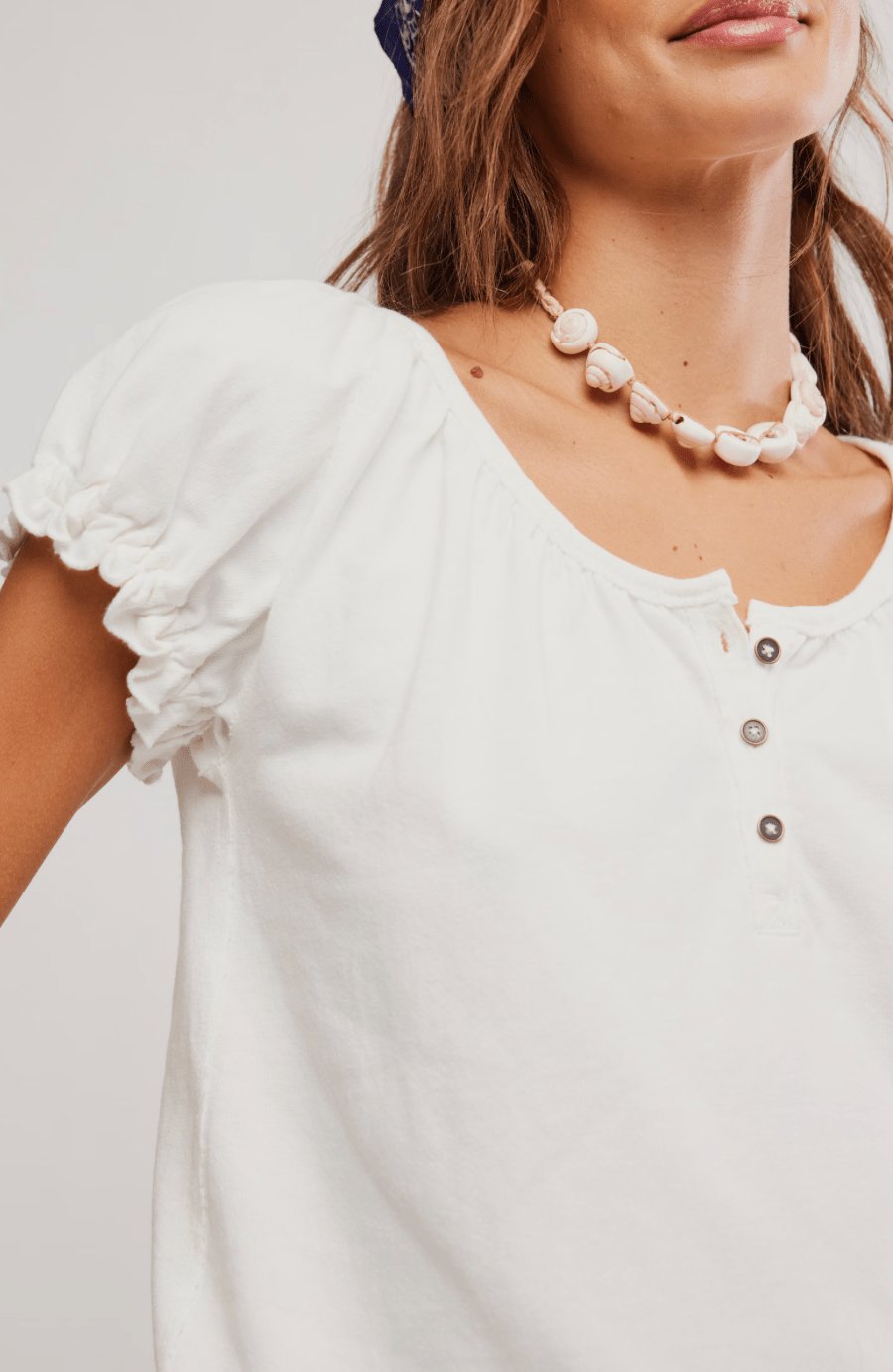 Elevate your everyday basics with the FREE PEOPLE Issa Tee, a timeless essential that blends comfort with charming feminine details. This relaxed-fit tee features delicate puffed sleeves and a scoop neckline with henley detailing for an effortlessly polished look.