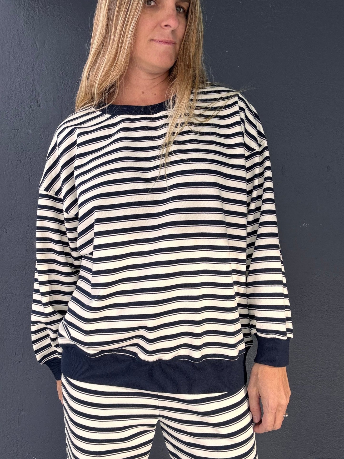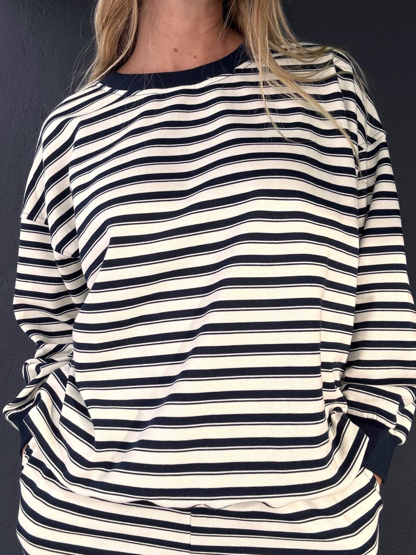 Get ready to brighten your casual wardrobe with the Shoreline Stripes Sweatshirt, featuring a cheerful cream and navy striped design that's perfect for any day. Its cozy cotton-polyester blend and washed finish make comfort and style your new best friends.