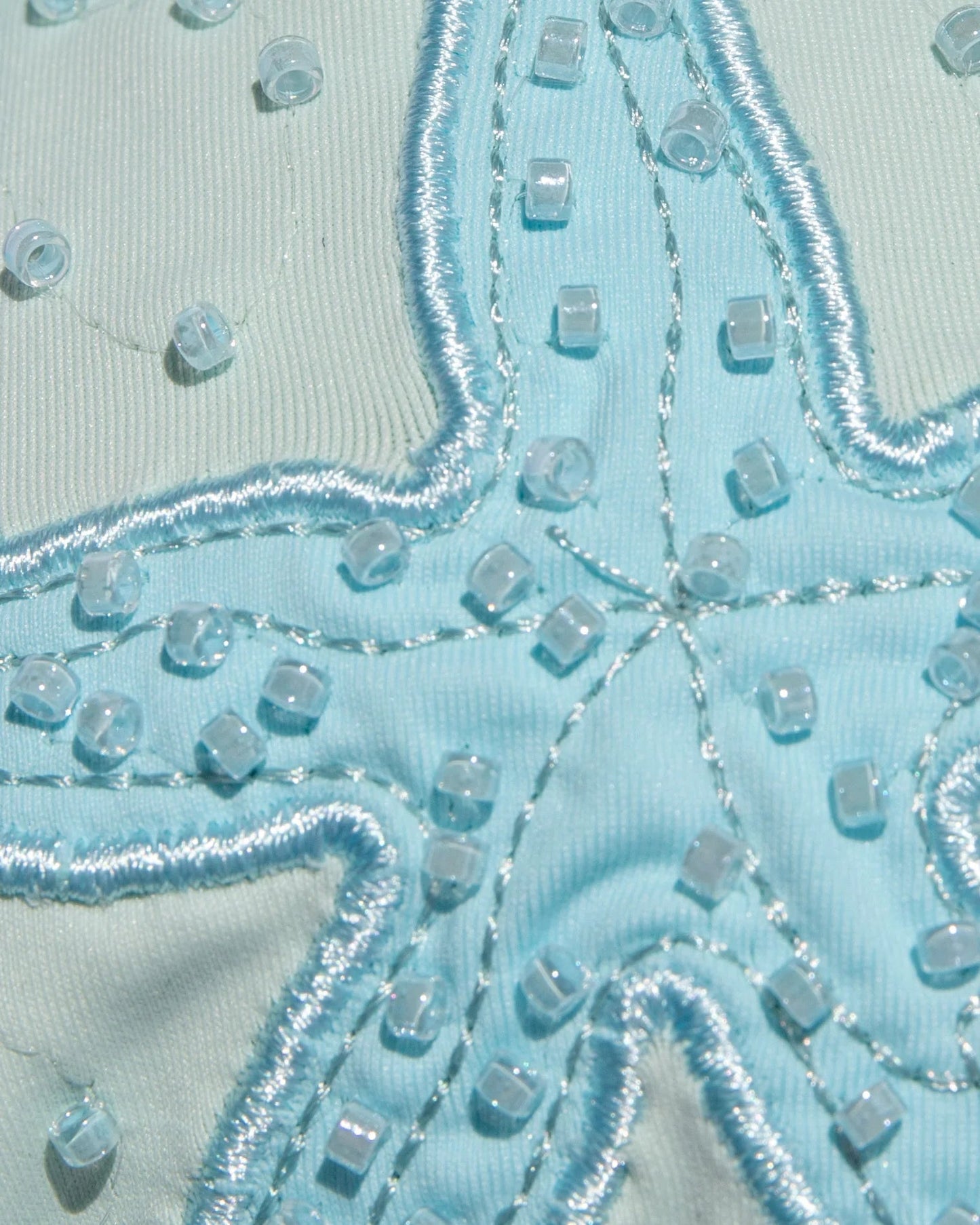 The LSPACE Kokomo Bikini Top in Light Aqua Tourmaline offers a flirty, barely-there fit with fully adjustable spaghetti strap ties for a perfect, personalized feel. Embroidered starfish add a whimsical touch, making you the cutest mermaid on the shore.