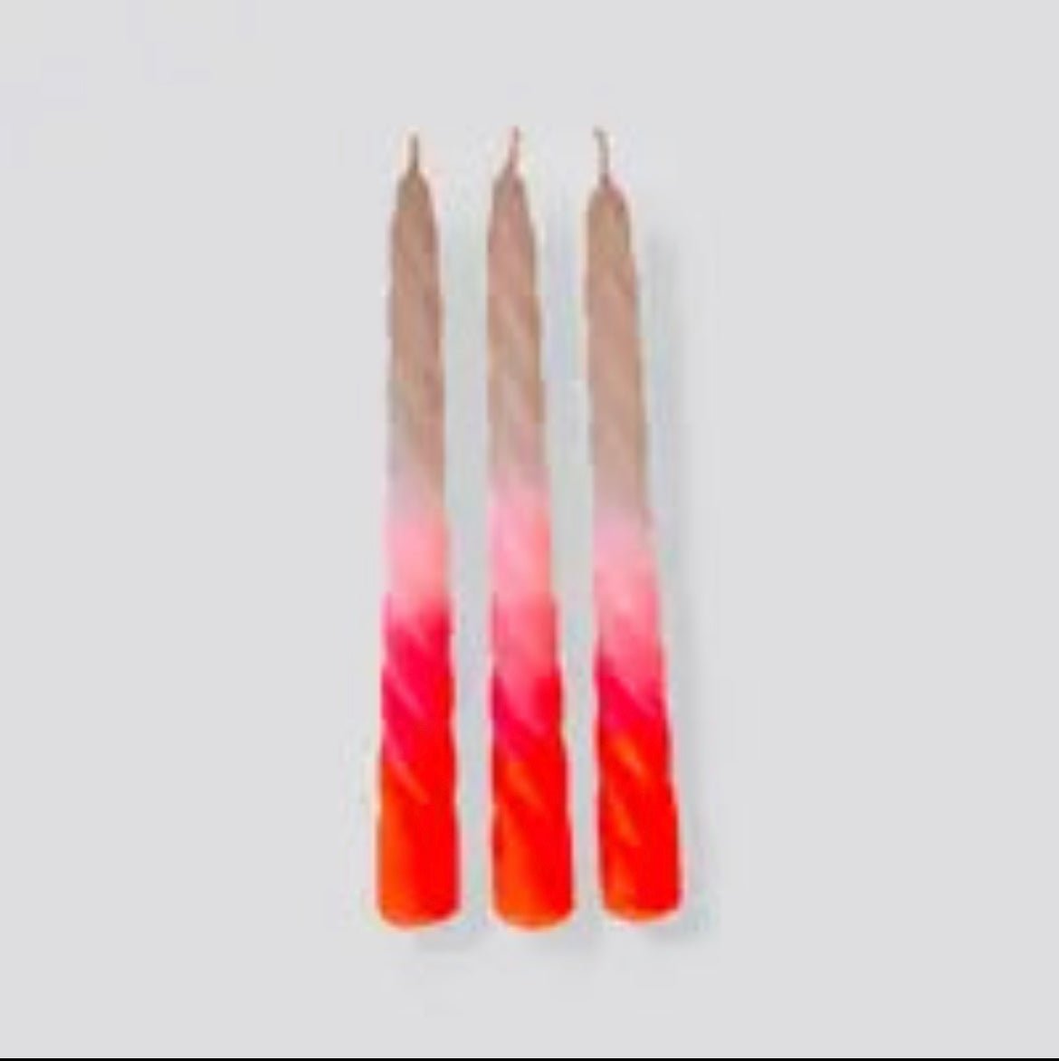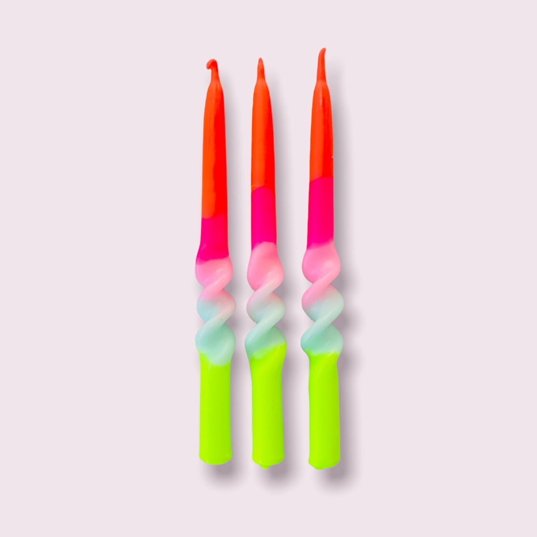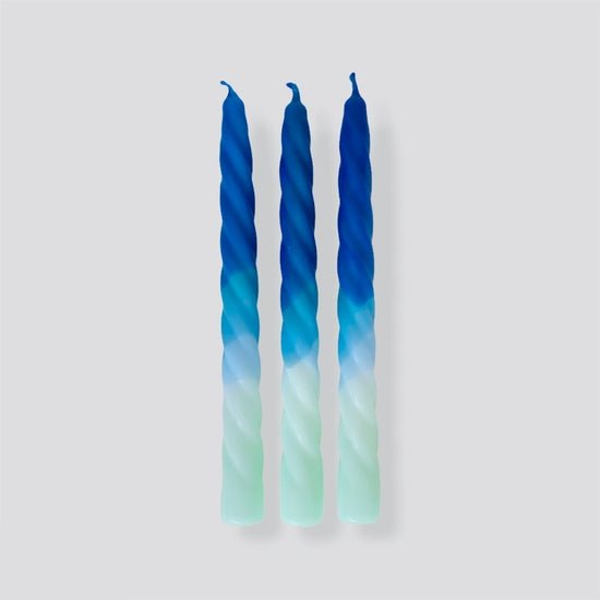 Set of three lovingly hand-dyed, twisted dinner candles. The colours remain the same, the patterns vary with each candle and make them unique. Dyed in cooperation with social institutions in the beautiful foothills of the Alps.