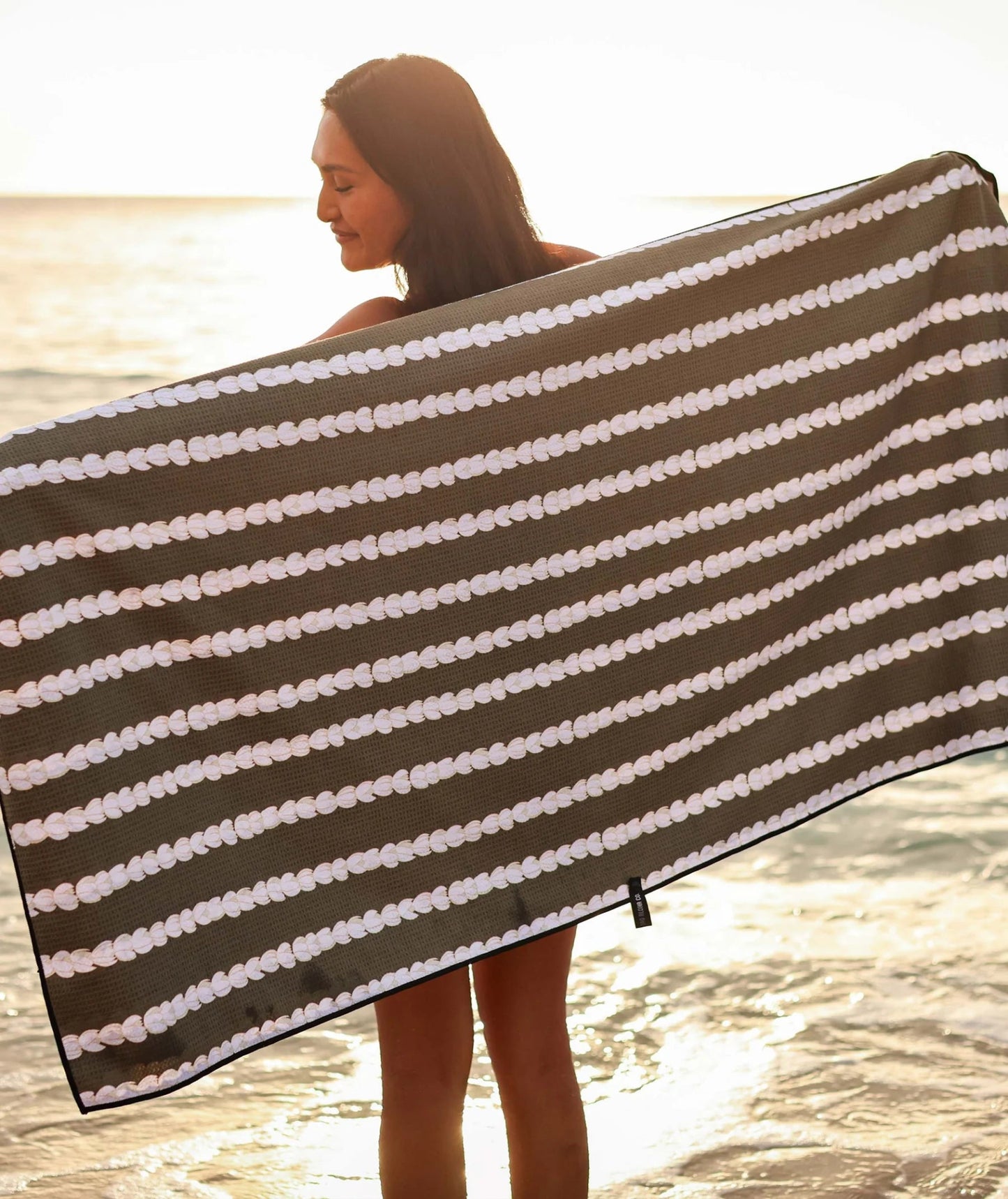 The TAG ALOHA Beach Towel - Pikake Lei is crafted from recycled bottles, turning trash into a vibrant, sand-free companion perfect for beach days or hot yoga sessions. With its super absorbent waffle weave and quick-drying fabric, this towel combines eco-friendly style with practical performance.