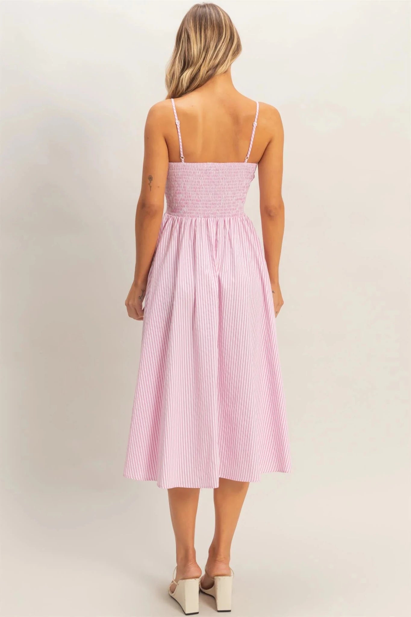 Slip into effortless spring style with this charming striped midi dress that's ready for sunny days and casual adventures. The fitted bodice and flared skirt create a flattering silhouette that twirls as beautifully as it photographs.