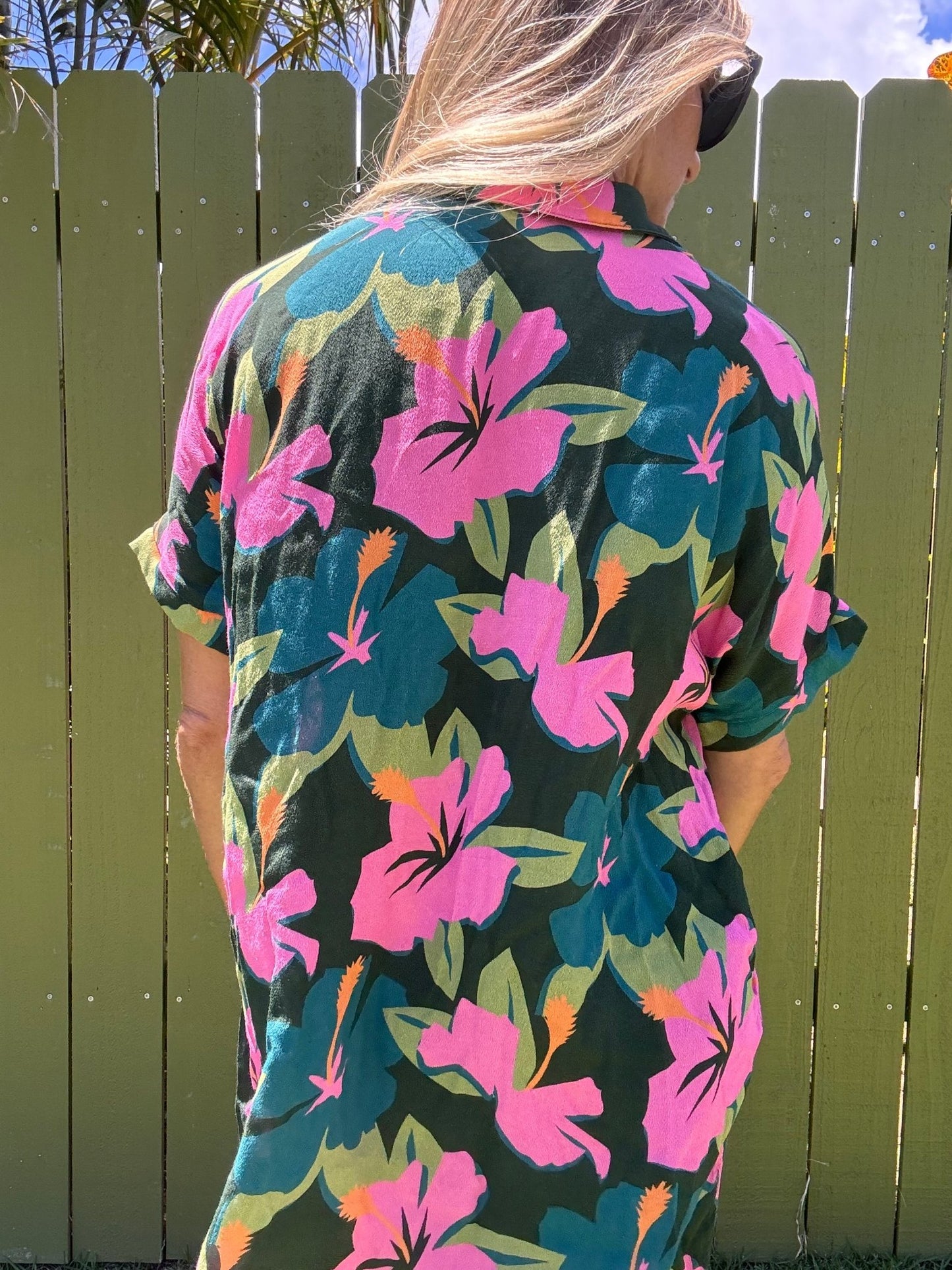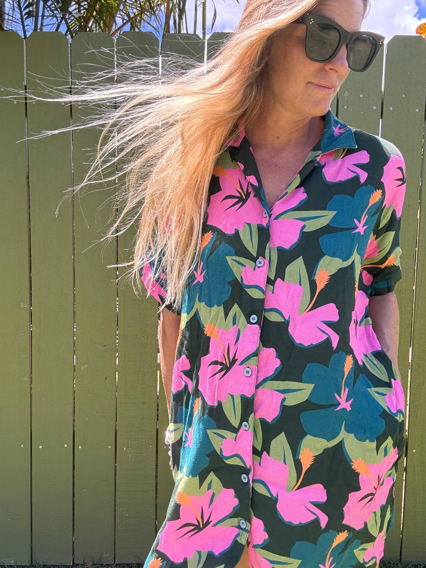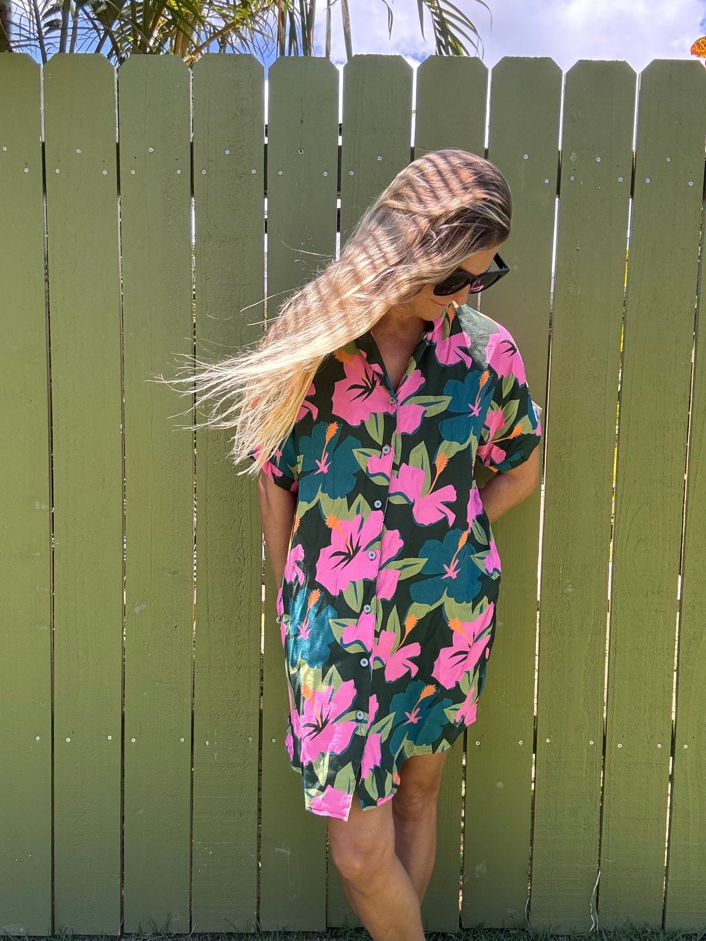 The Water Hibiscus Shirt Dress is a breezy, mid-length button-down perfect for layering over your favorite swimwear from the HI Voltage collection.