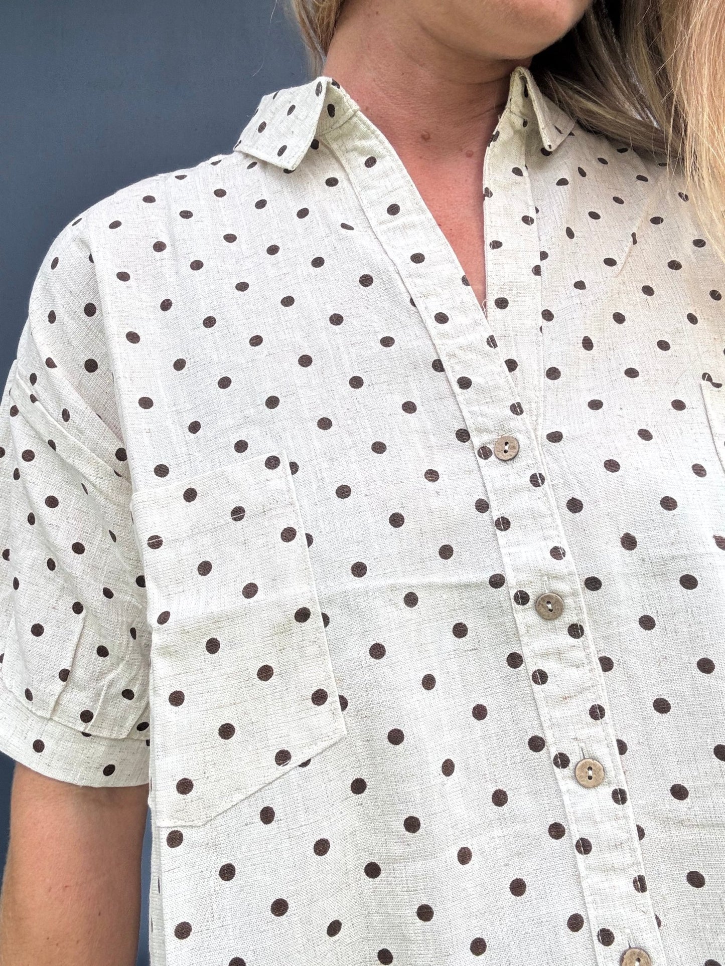 Throw on this breezy button-up and let those polka dots do the talking—it's the perfect laid-back layer for sunny days and good vibes.