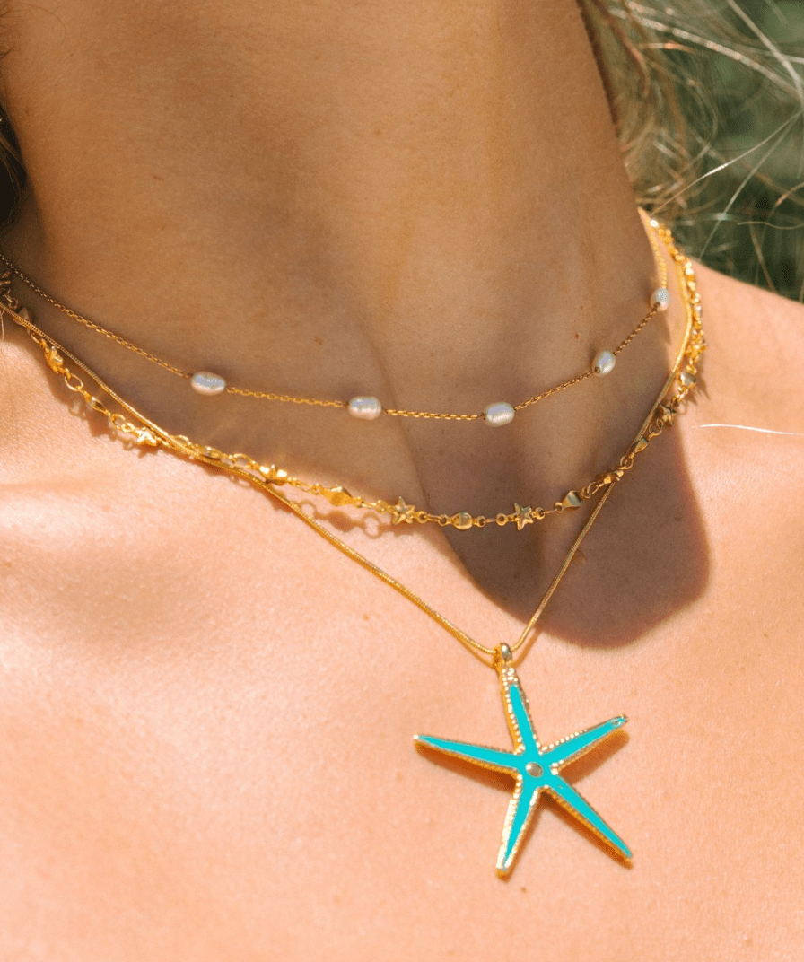 The Starry Seas Necklace is a stack that is sure to elevate your beachy look! This 24k gold plated star chain is perfect for swimming in the ocean sunrise to sunset! 16”
