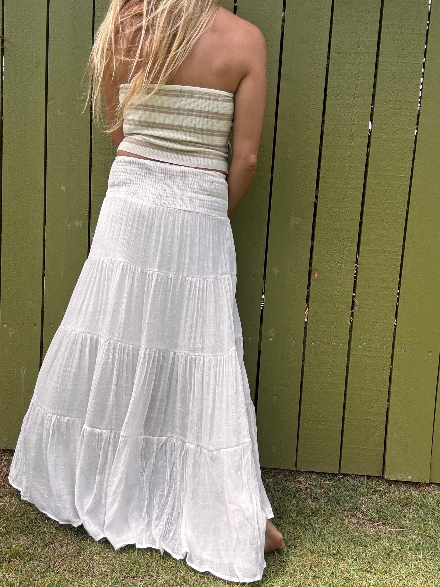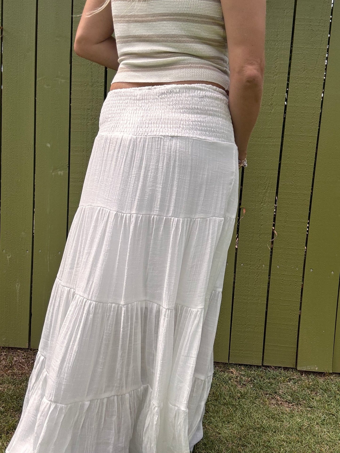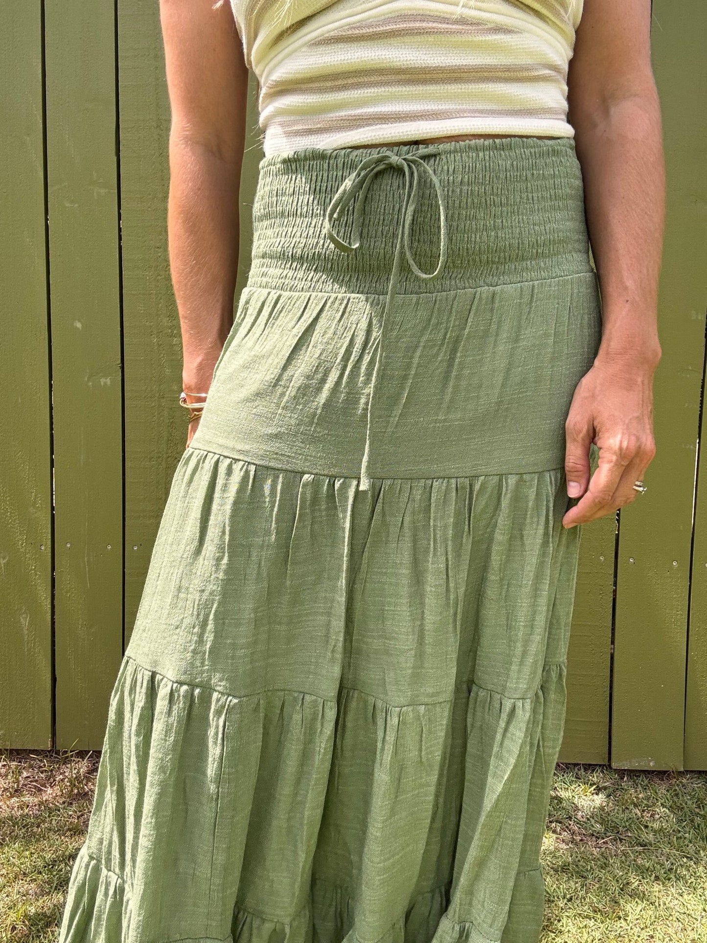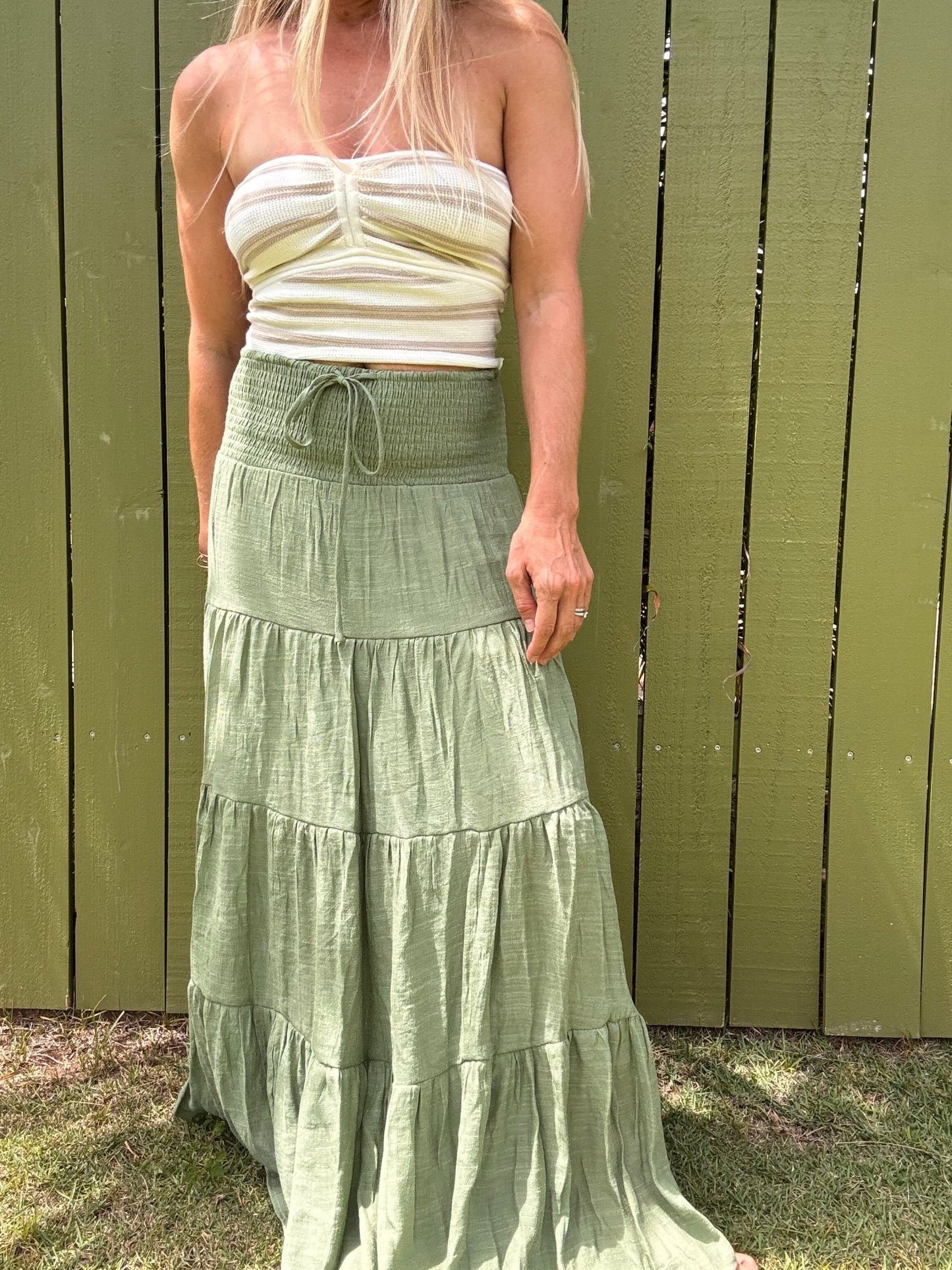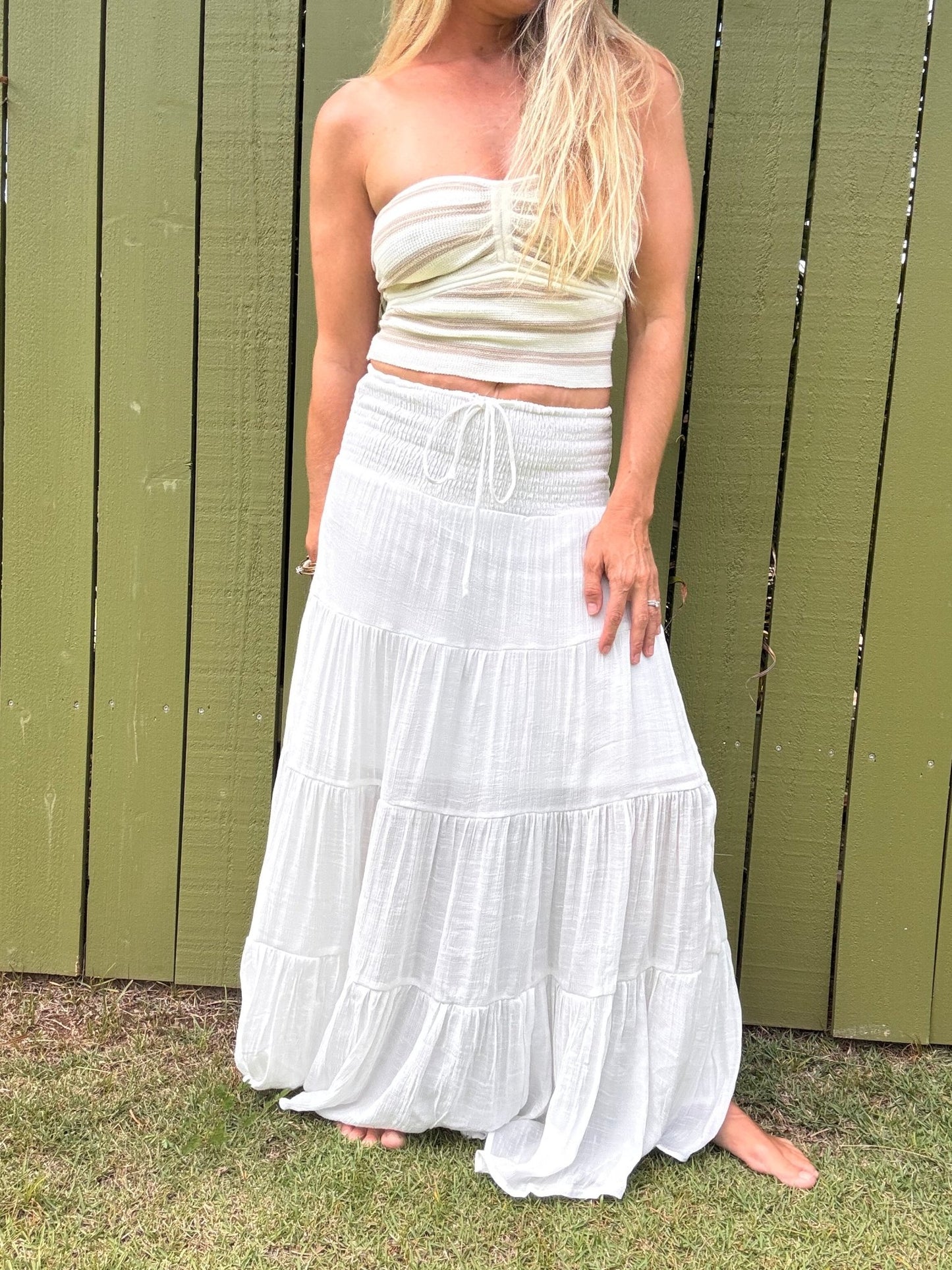Dance through the day in this Amber Smocked Maxi Skirt. With a gathered style and tiered detailing, this flowy skirt exudes romance and femininity. The ankle-skimming hem and elastic high waist, complete with a drawstring, provide both comfort and style. Perfect for charming everyone you encounter!