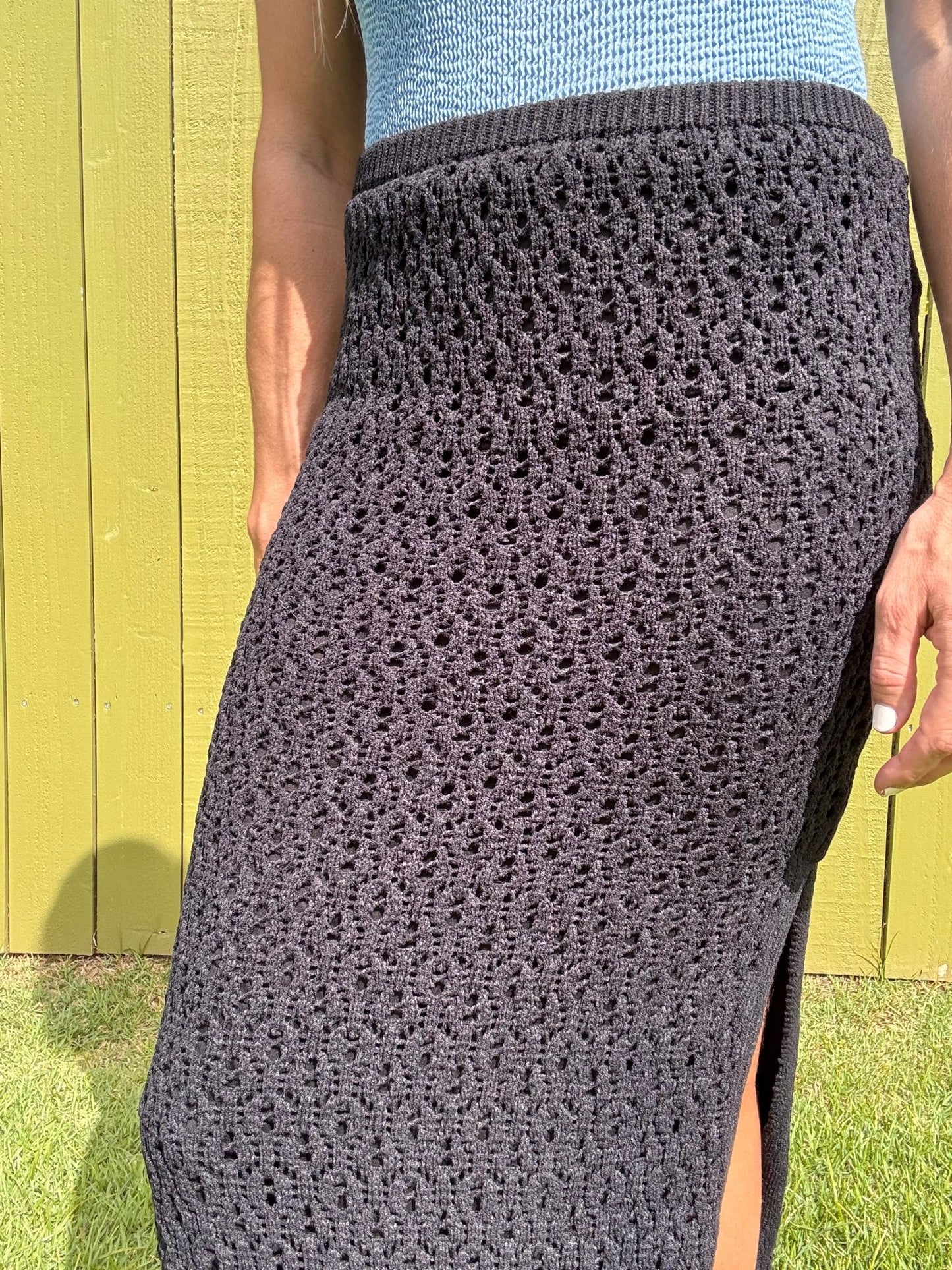 Be chic and carefree in our Black Open Knit Midi Skirt. With its open knit design, this skirt offers breathability while still keeping you stylish. Perfect for any day, this midi skirt is a versatile addition to your wardrobe. Own your look with this unique and playful piece!