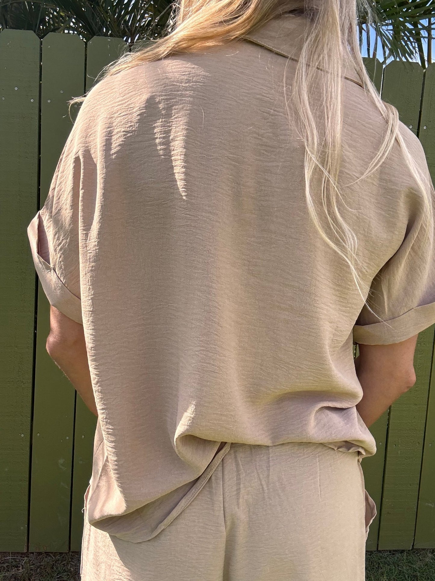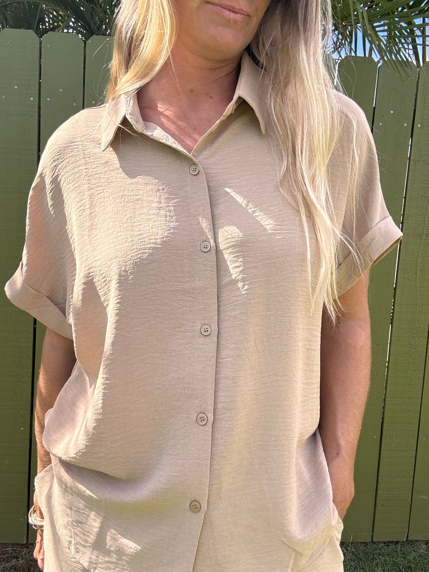Stay cozy and stylish in our Latte Cuffed Top! Made with soft and airy material, this shirt features rolled cuffs, a short sleeve dolman cut and a button front for added flair. Perfect for a relaxed day at the cafe or a casual night out with friends. Make it the perfect matching set with our Latte Tie Shorts!