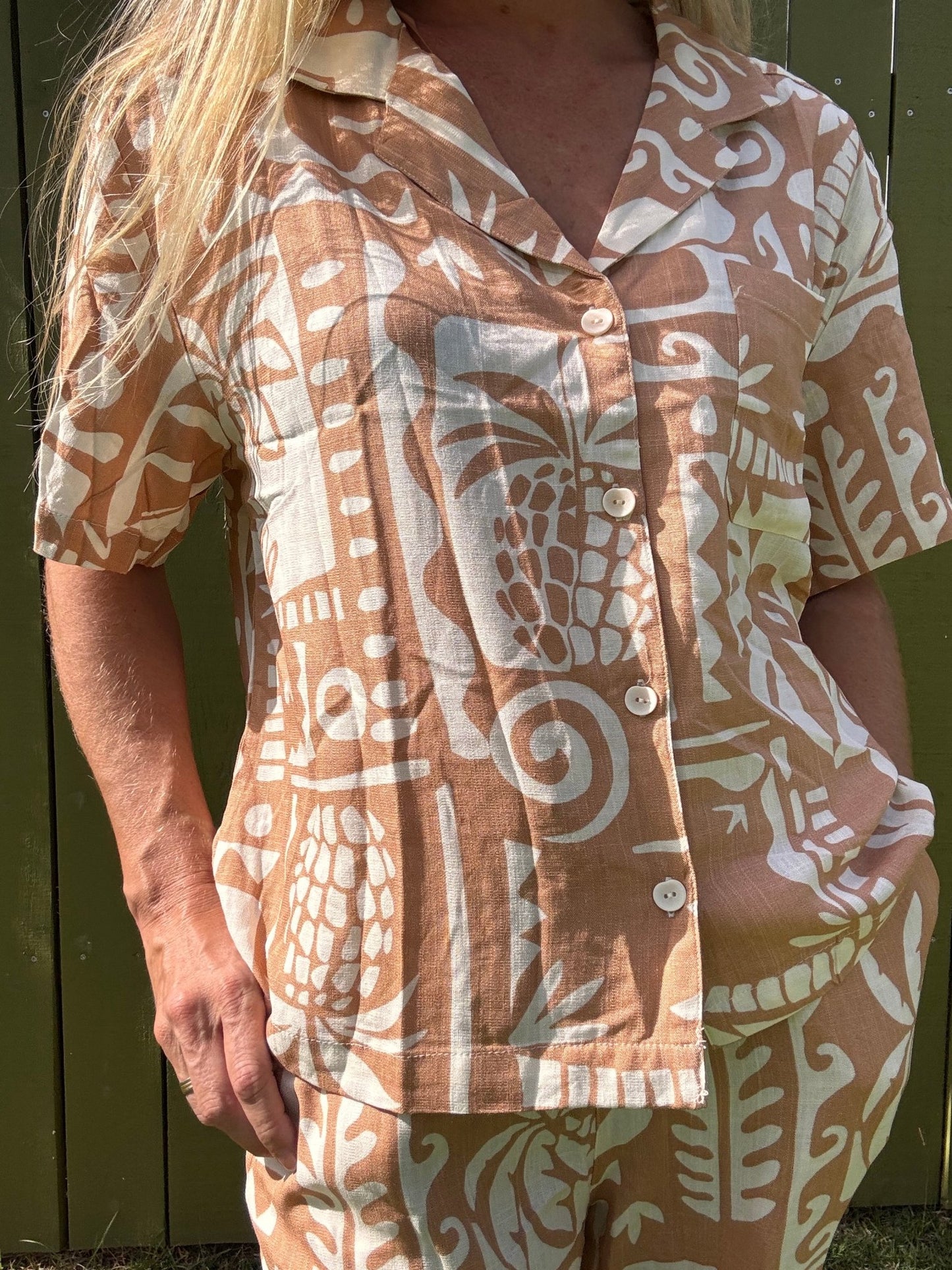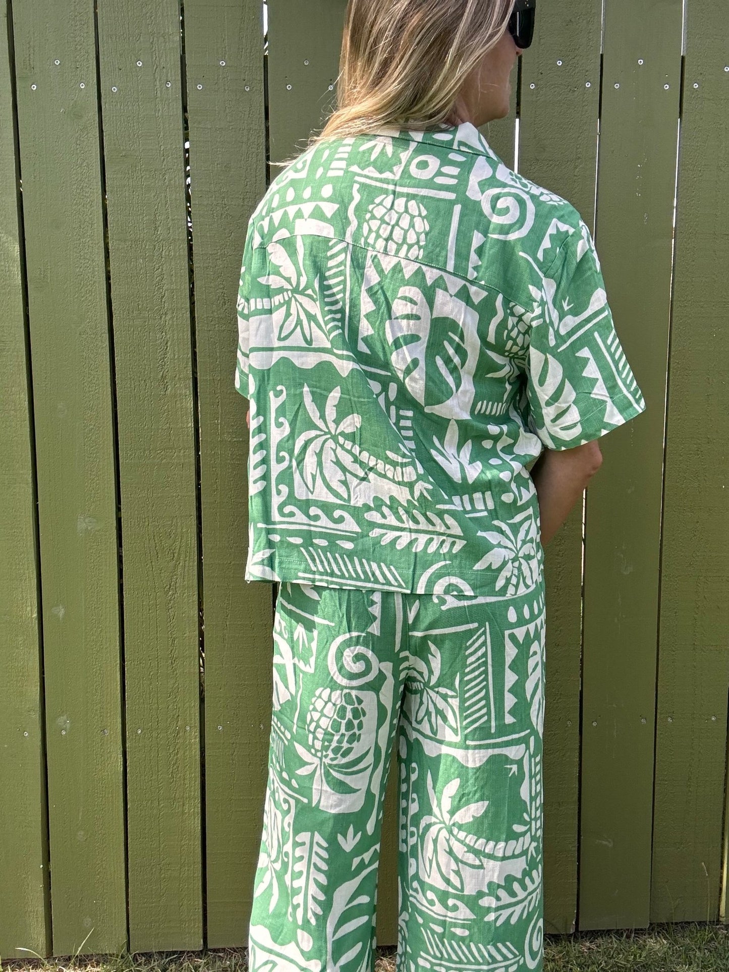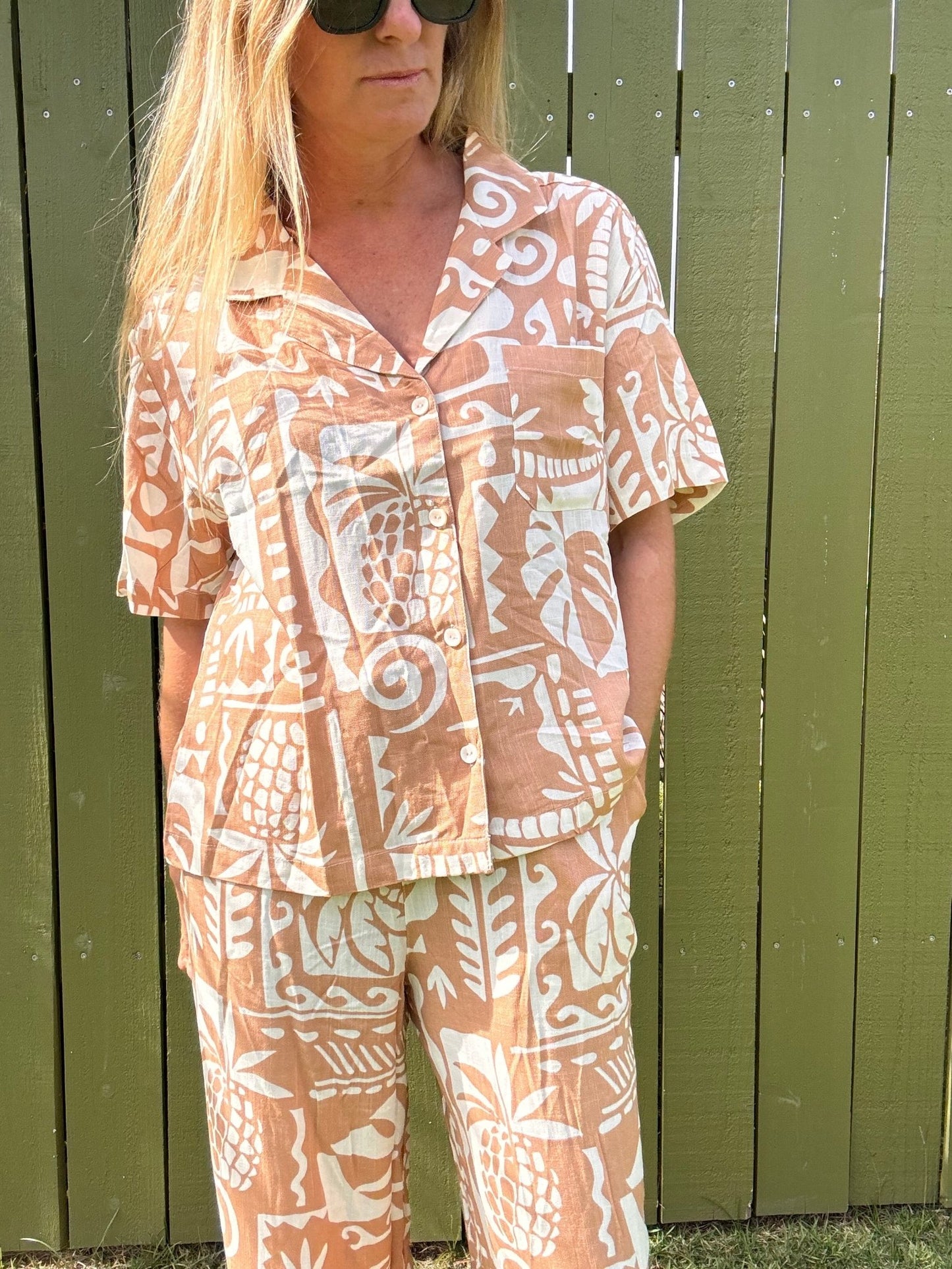 Regular price $30.00 USDAdd a playful touch to your wardrobe with the Sunset Stroll Button Down Shirt. This resort top features a unique print and short sleeves for a relaxed, yet stylish look. Complete with a convenient patch pocket, this shirt is perfect for a casual day out or a fun night out on the town. Pair with our Sunset Stroll Wide-Leg Pants!