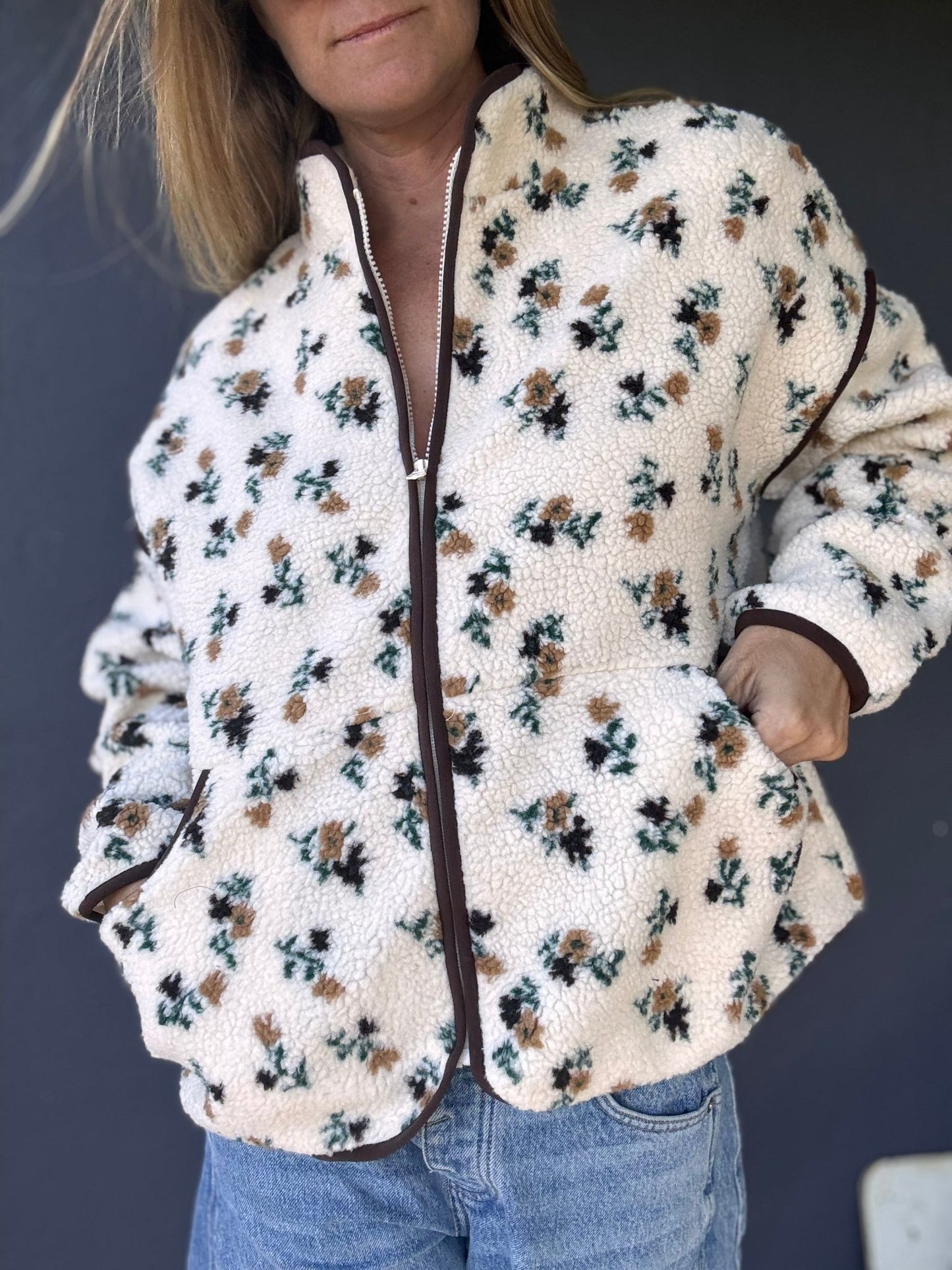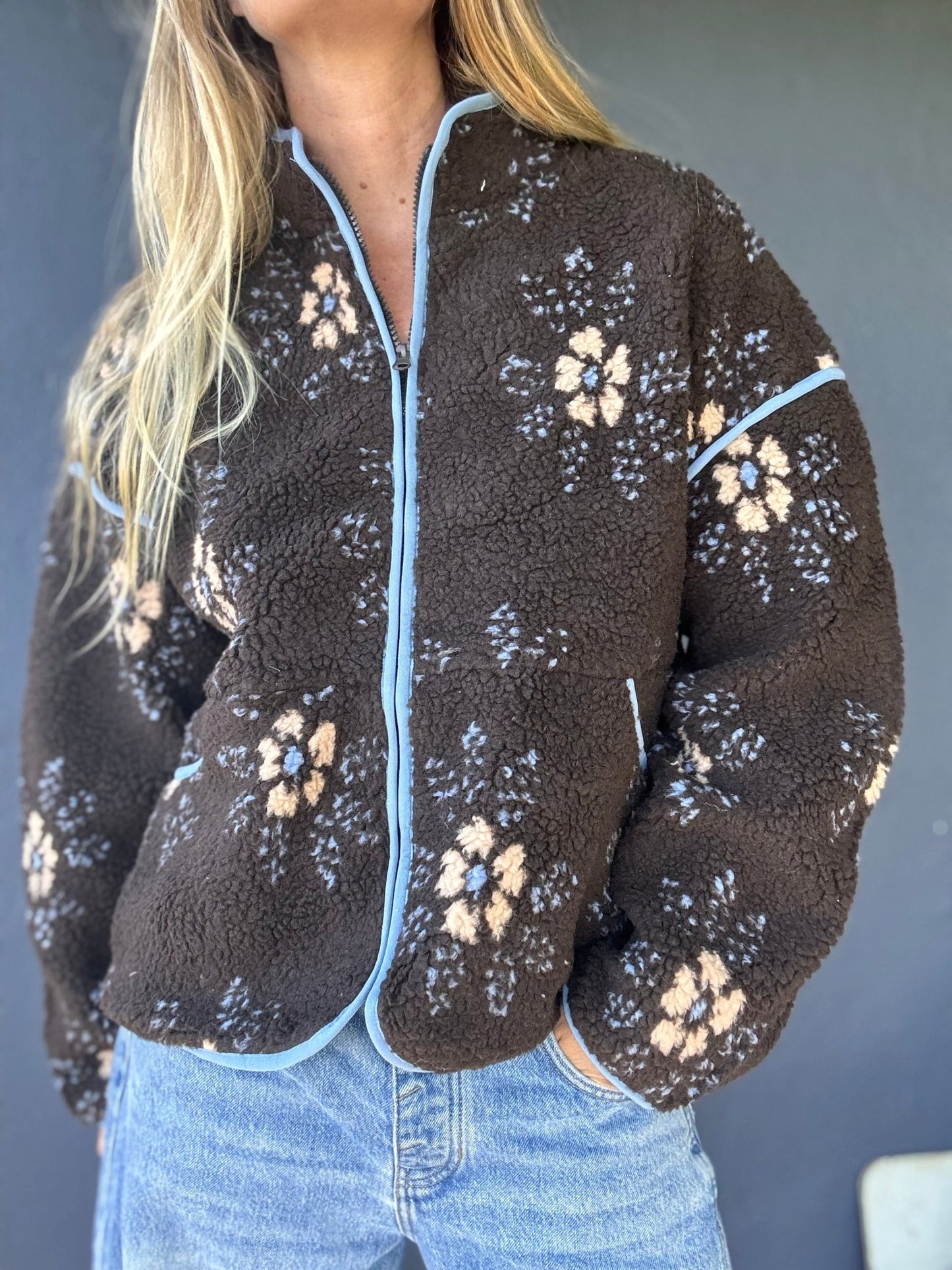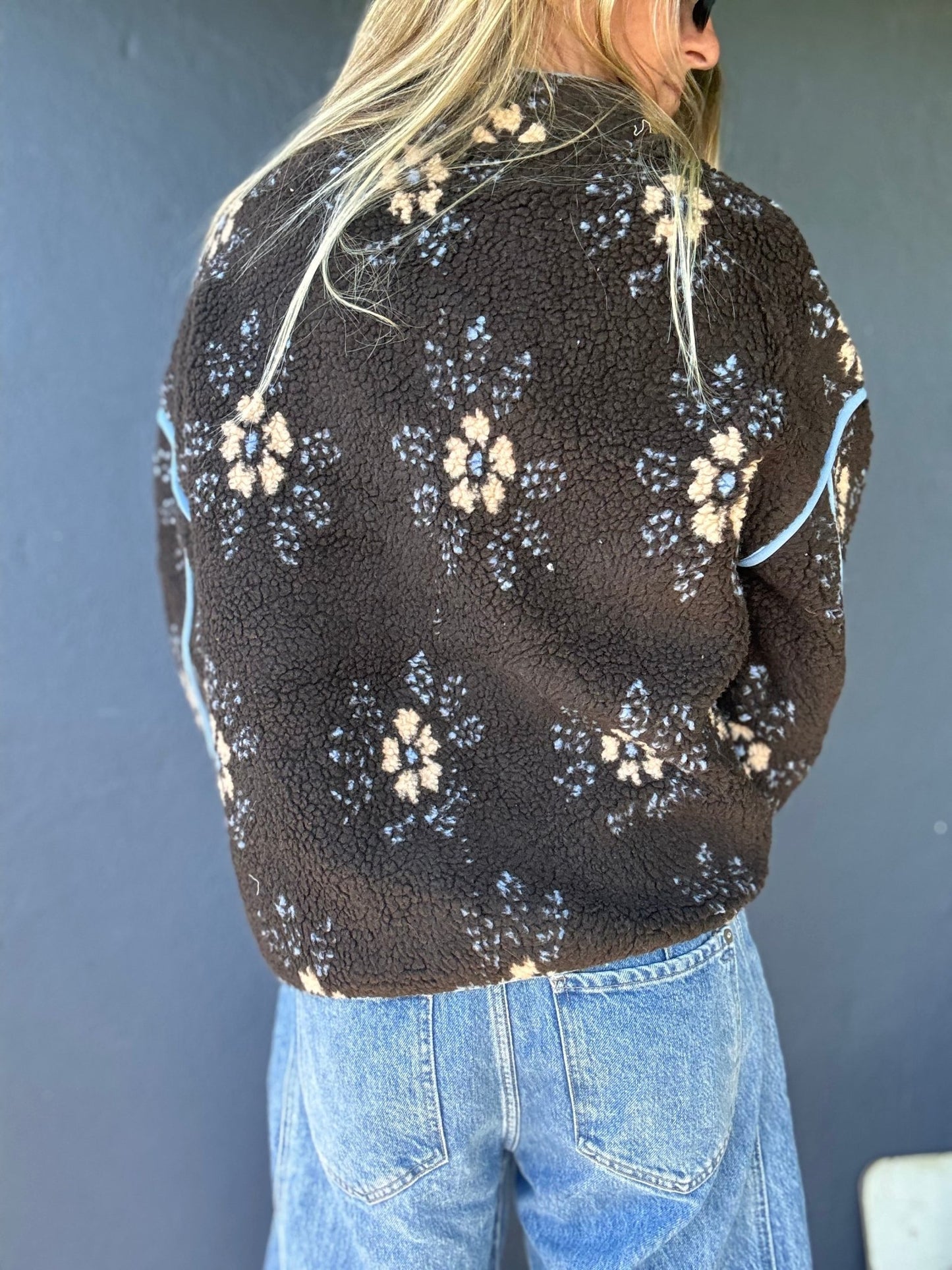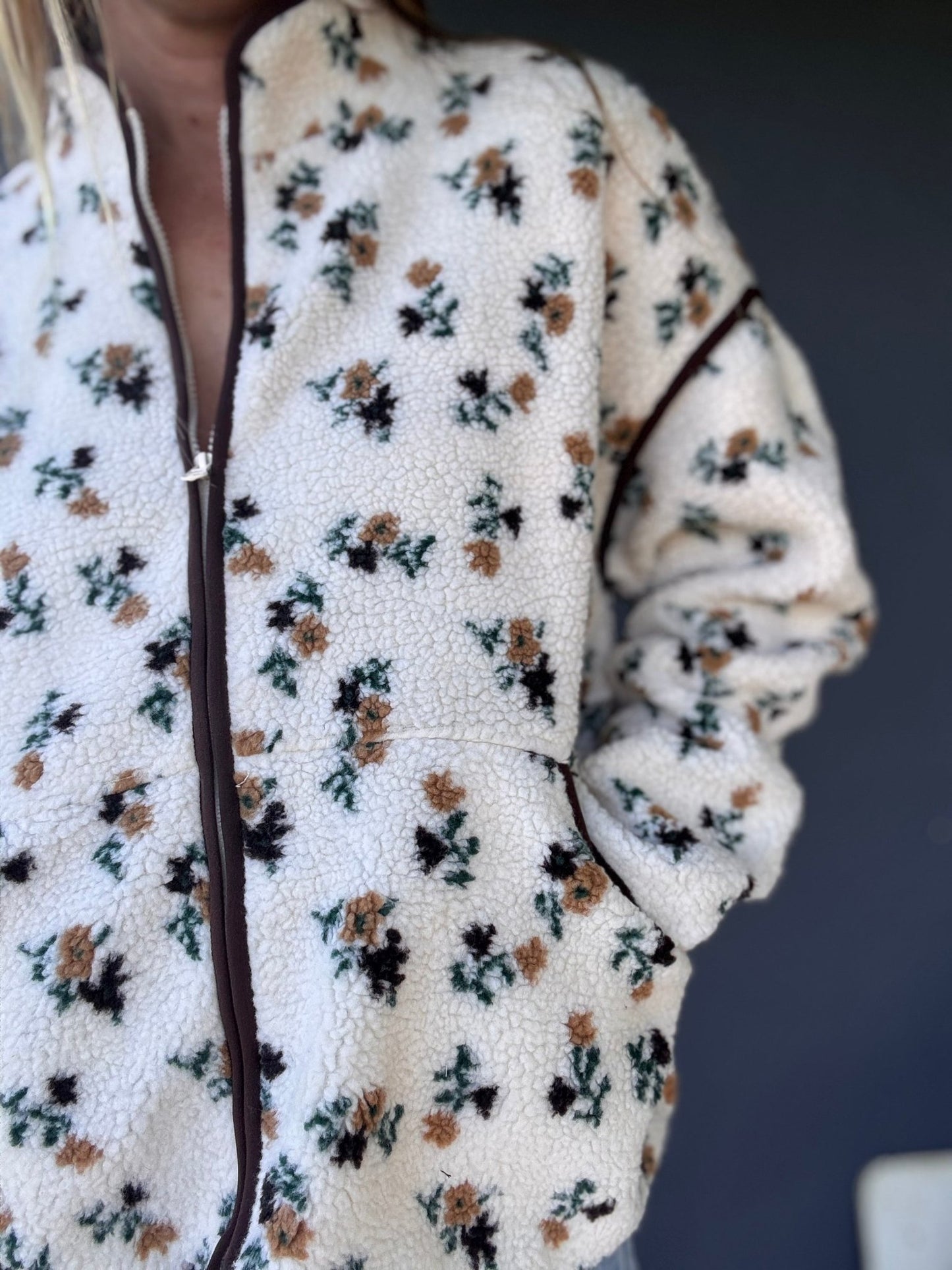 Wrap yourself in cozy charm with the Fleur Noir Sherpa Jacket, perfect for chilly days when you want to stay snug without sacrificing style. Its oversized fit and bold floral print make it a standout piece that’s effortlessly comfy and fun.
