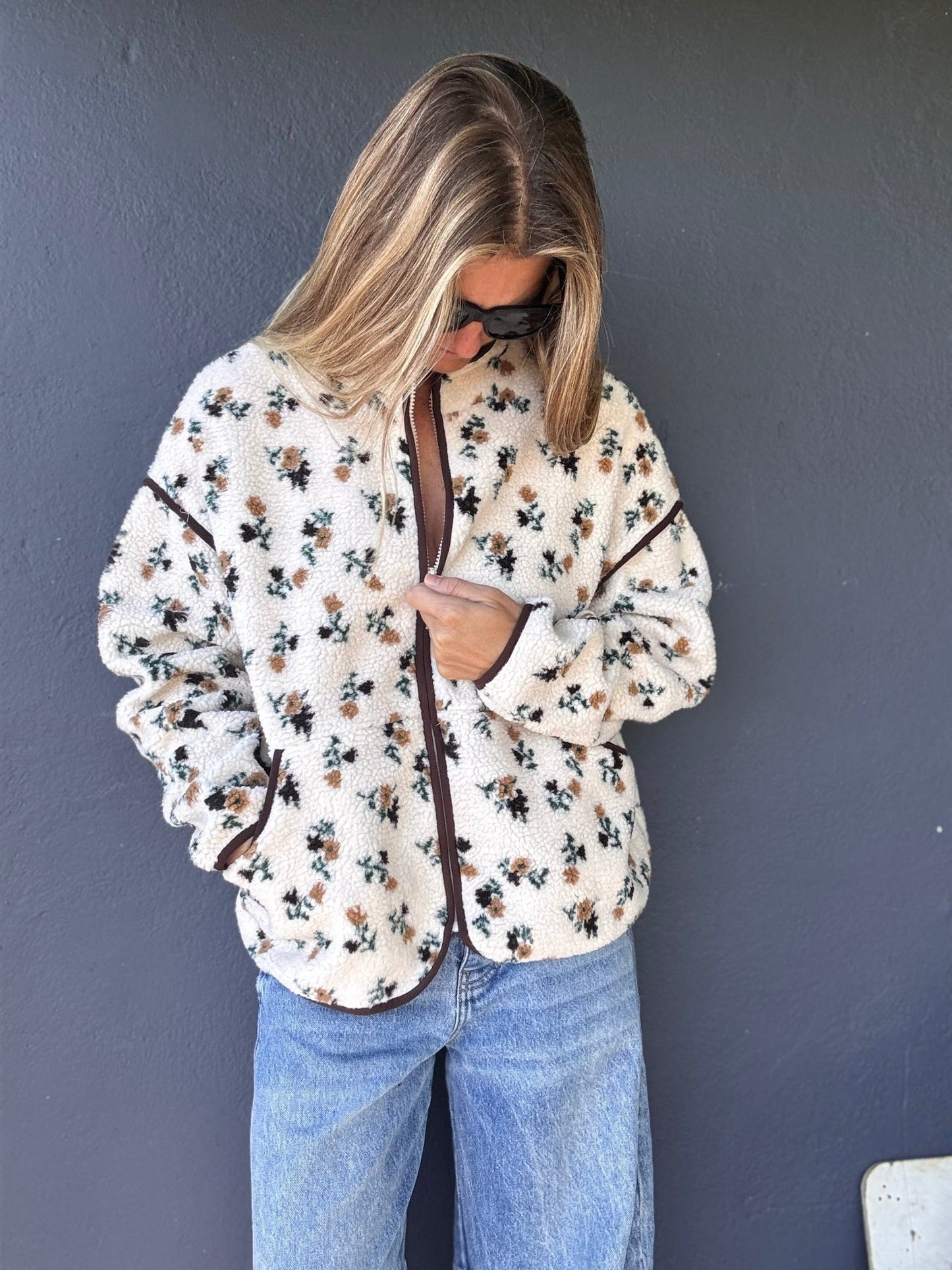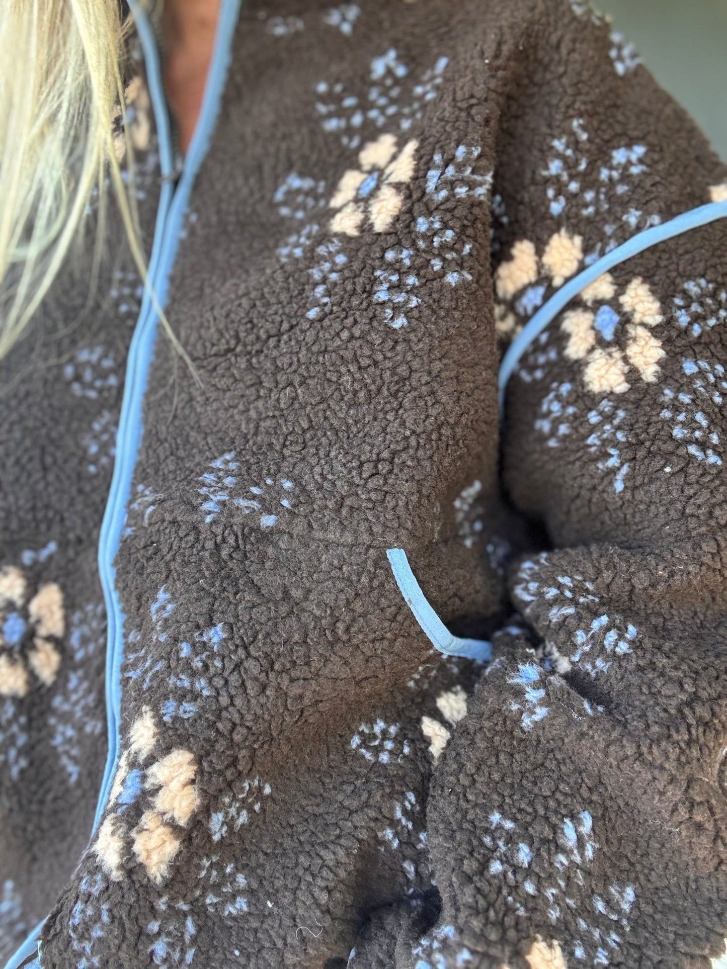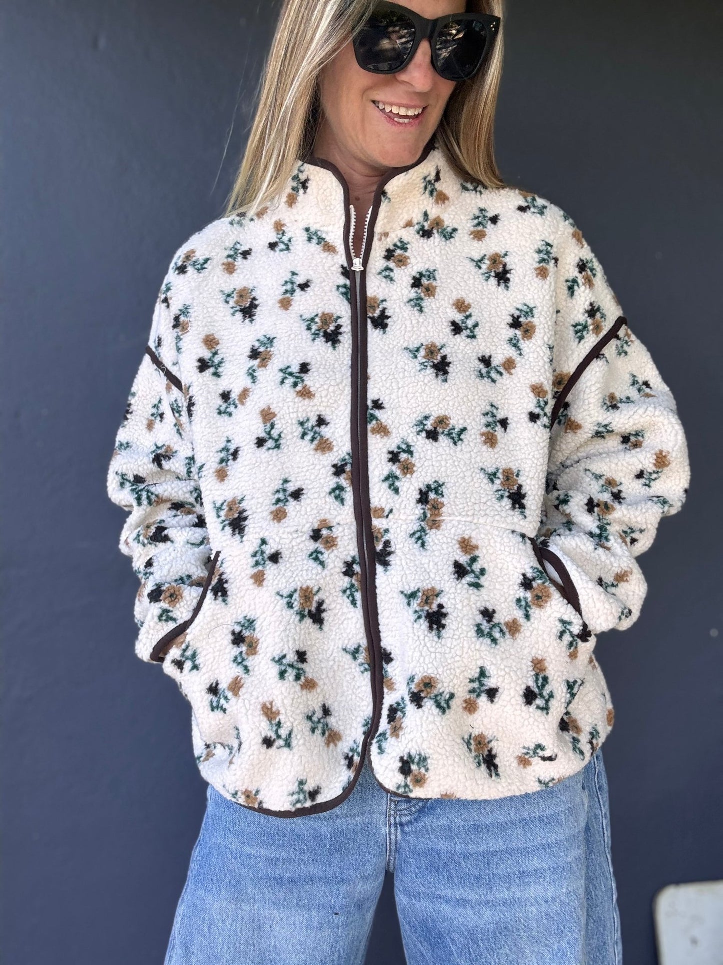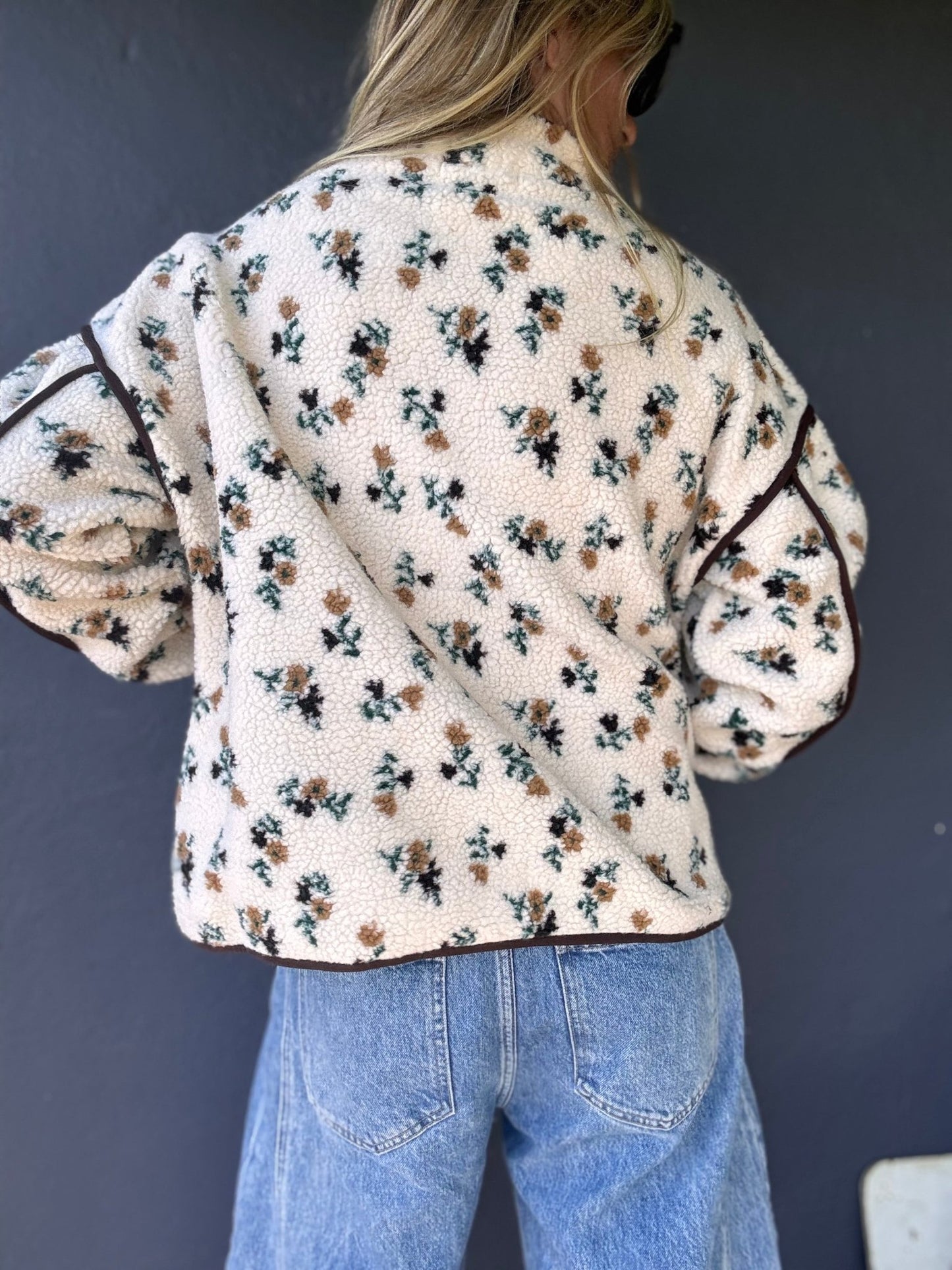 Wrap yourself in cozy charm with the Fleur Noir Sherpa Jacket, perfect for chilly days when you want to stay snug without sacrificing style. Its oversized fit and bold floral print make it a standout piece that’s effortlessly comfy and fun.