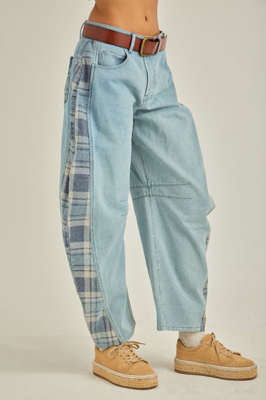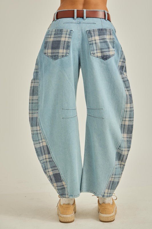 Step into fun with the Plaid Play Barrel Jeans, where classic denim meets a cheeky plaid twist for an effortlessly cool look. These jeans bring comfort and style together with a relaxed barrel fit that’s perfect for any playful day out.