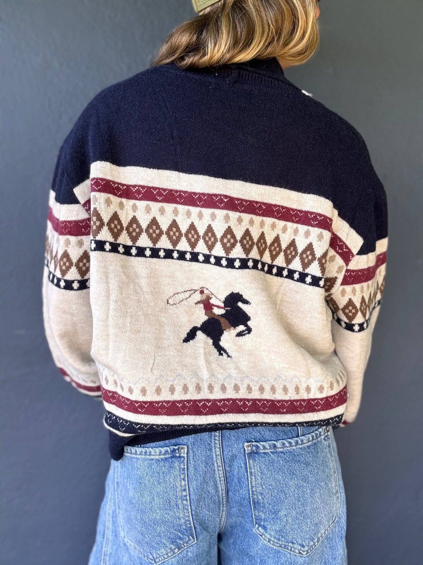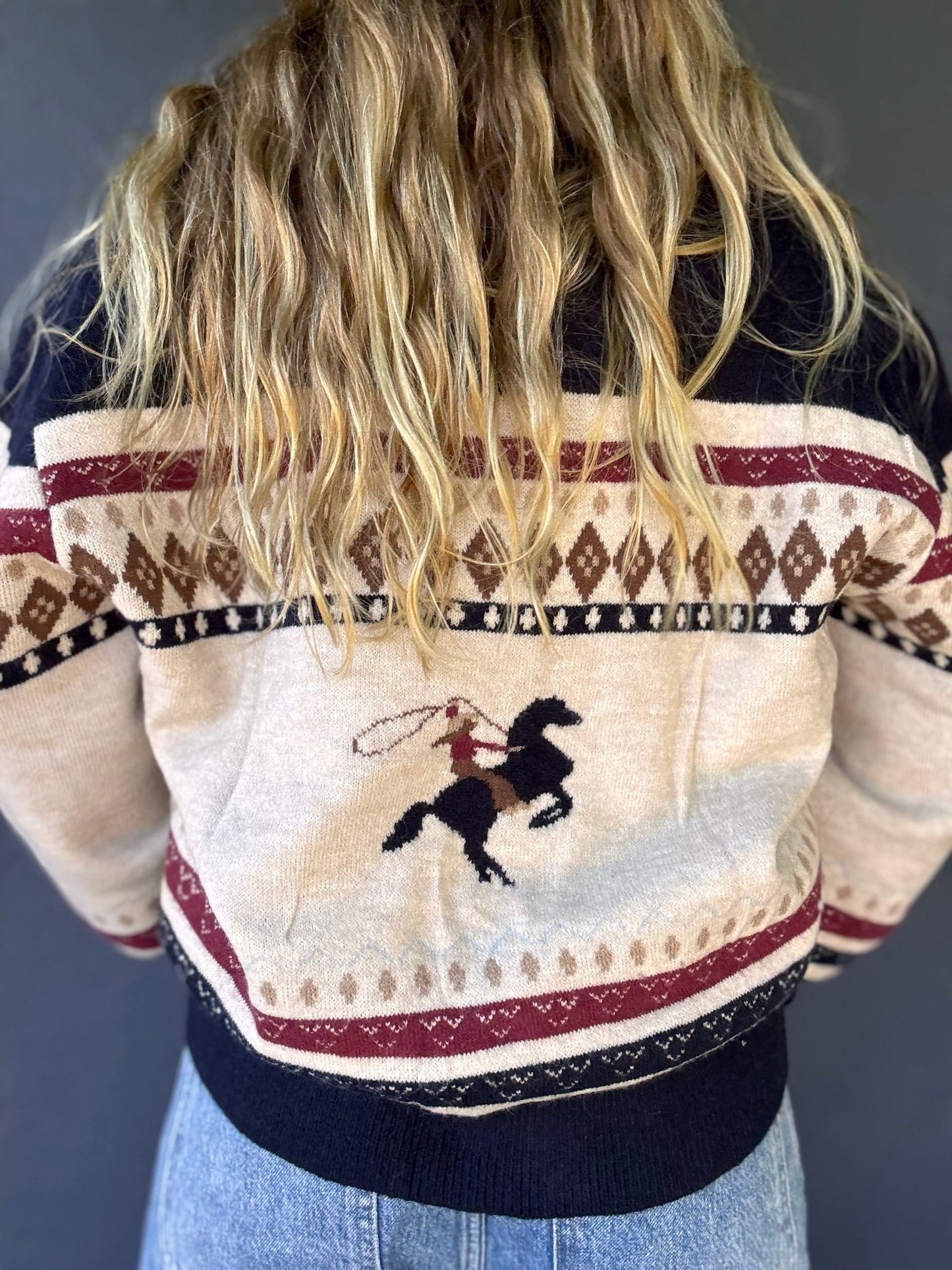 Get cozy and stylish with the Saddle Up Cardigan, featuring a charming horse graphic and an oversized fit perfect for layering on chilly days. This playful button-up sweater brings warmth and whimsy to your wardrobe with every wear.