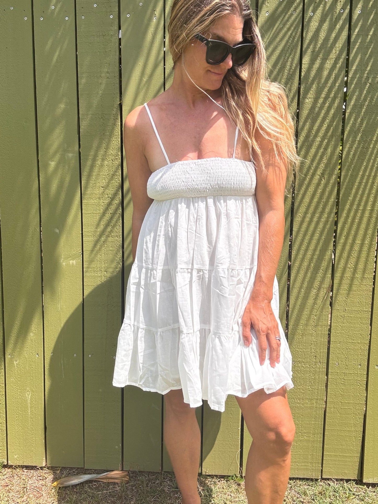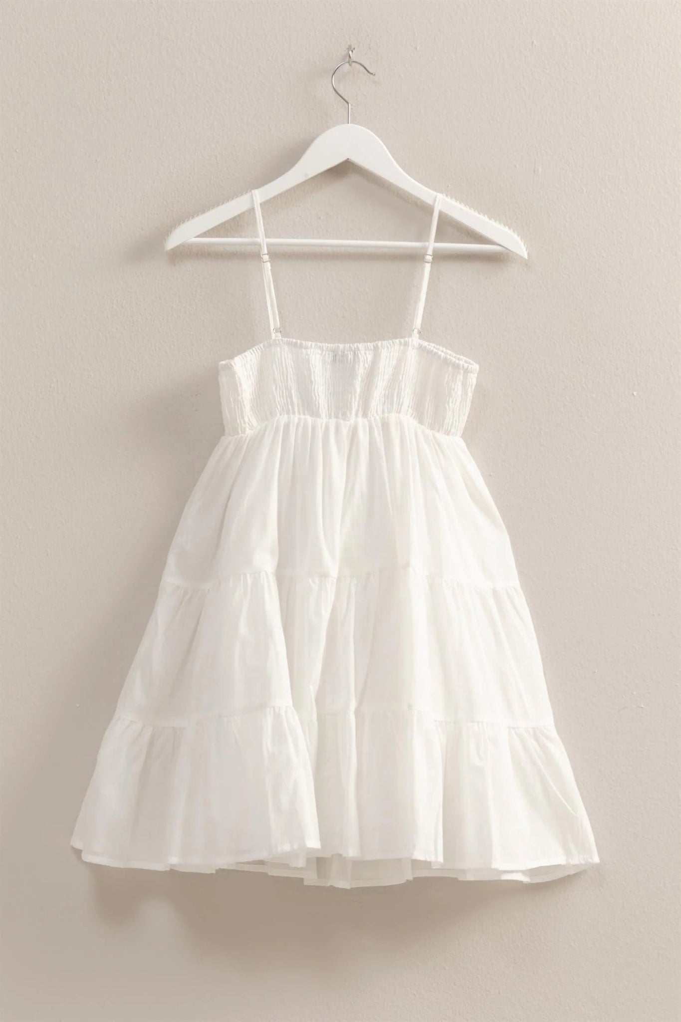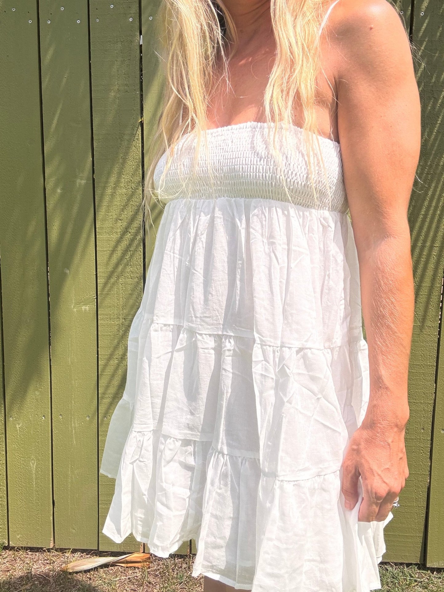 Indulge in this flowy and fun mini dress this summer! Made from lightweight cotton voile, this stunner features dainty shoulder straps and a smocked bust for a flattering fit. The tiered skirt adds a playful touch to this must-have dress. Don't miss out on this treat for yourself!
