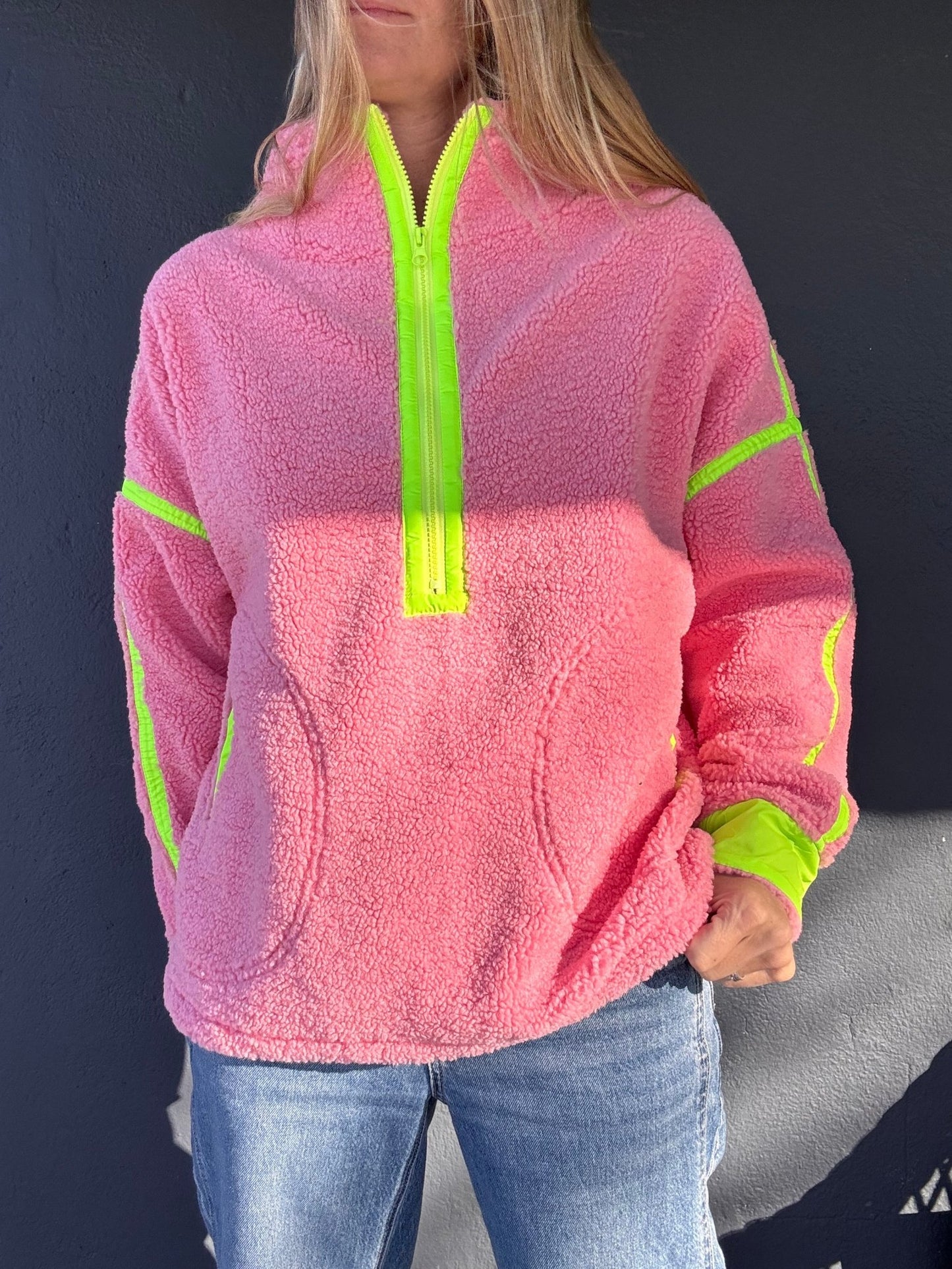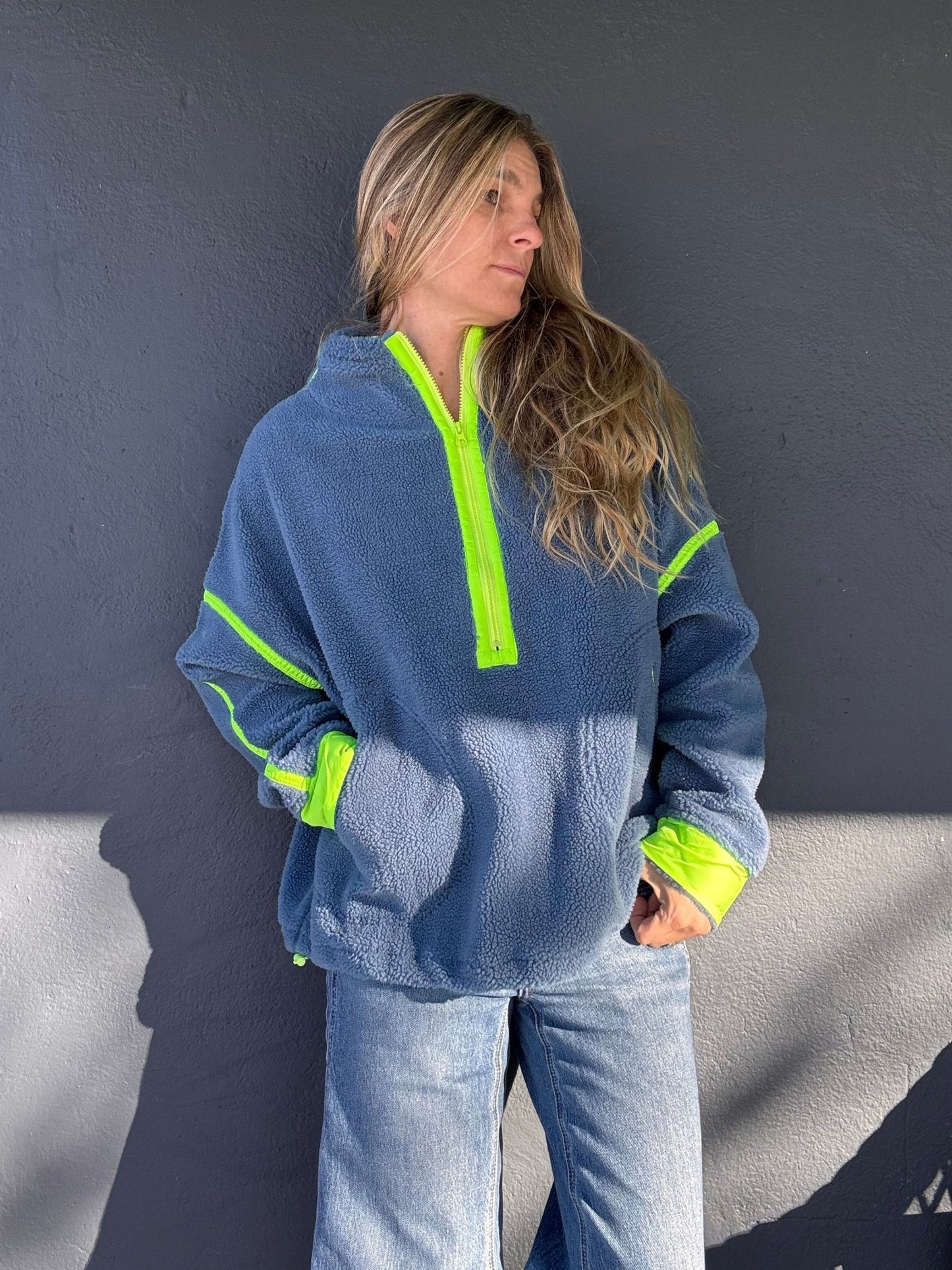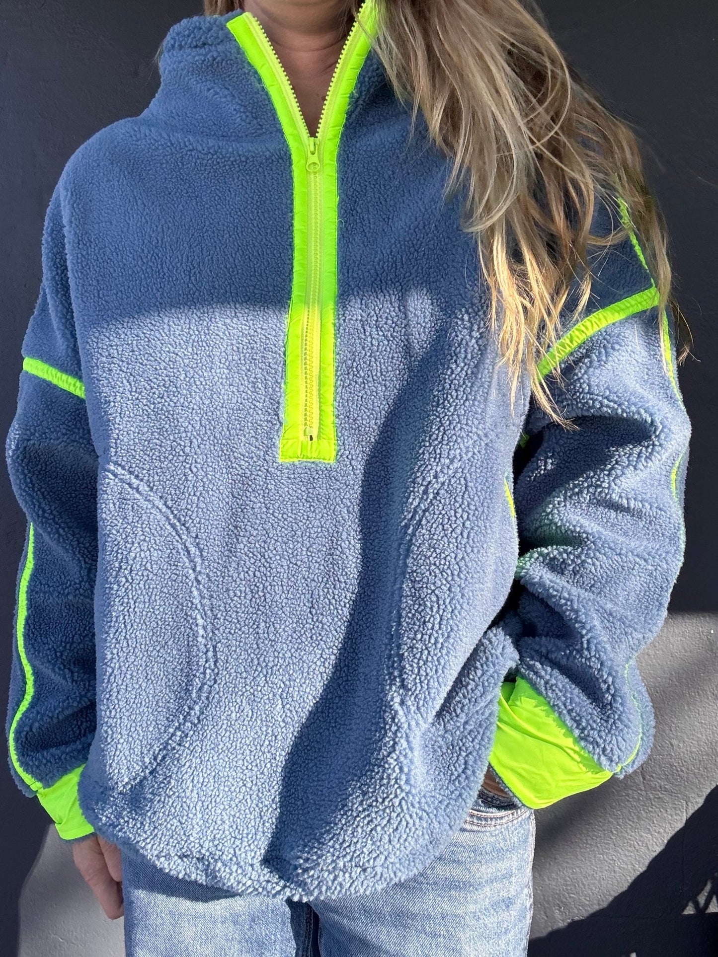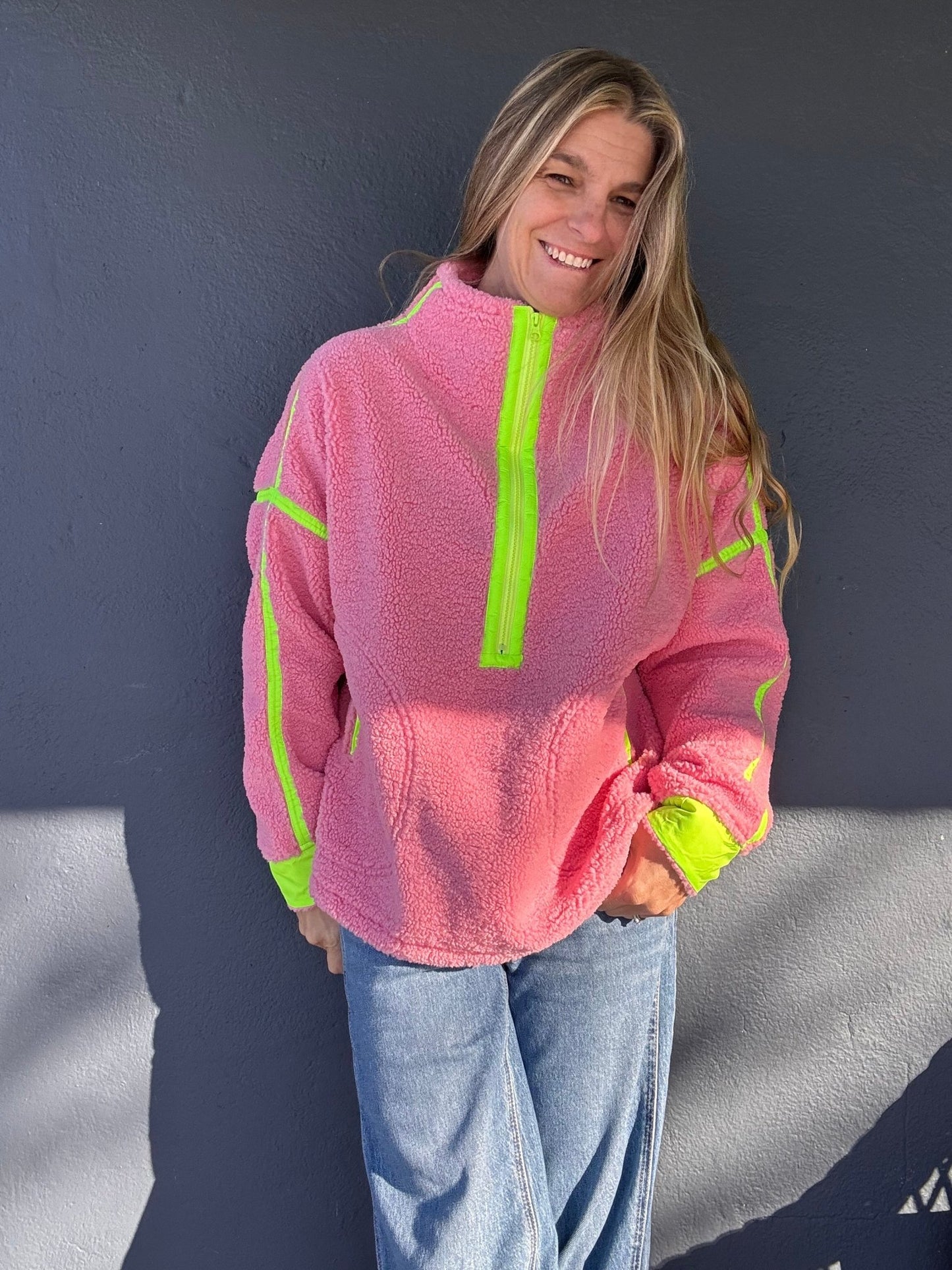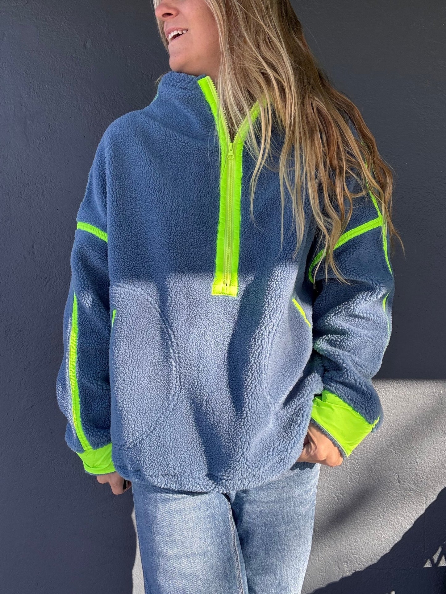 Stay cozy and stylish with the Zip & Chill Fleece Pullover, featuring a fun pop of color in Navy/Lime or Pink/Lime. Perfect for hiding your essentials and keeping warm on those chill days!