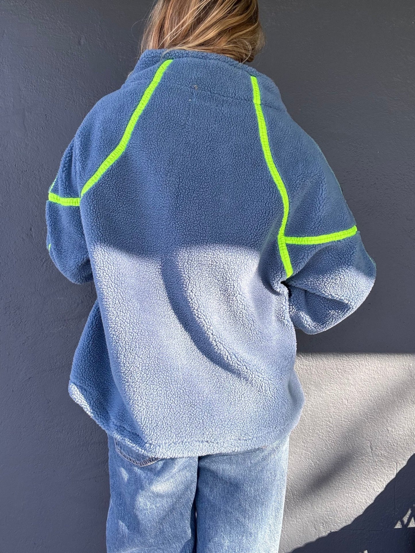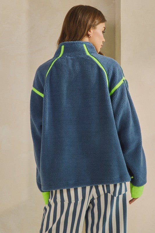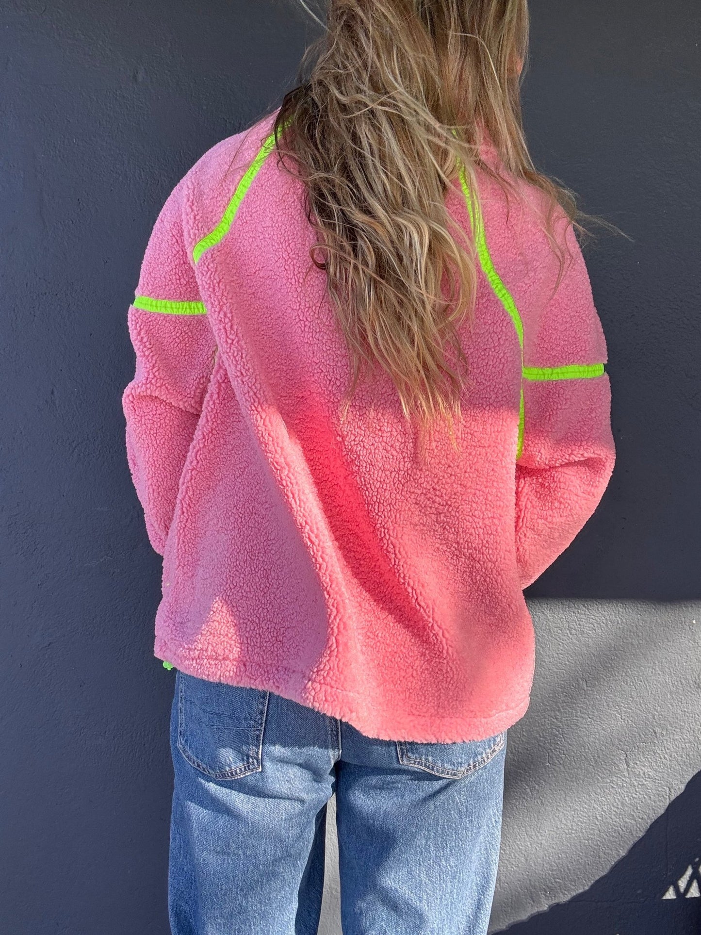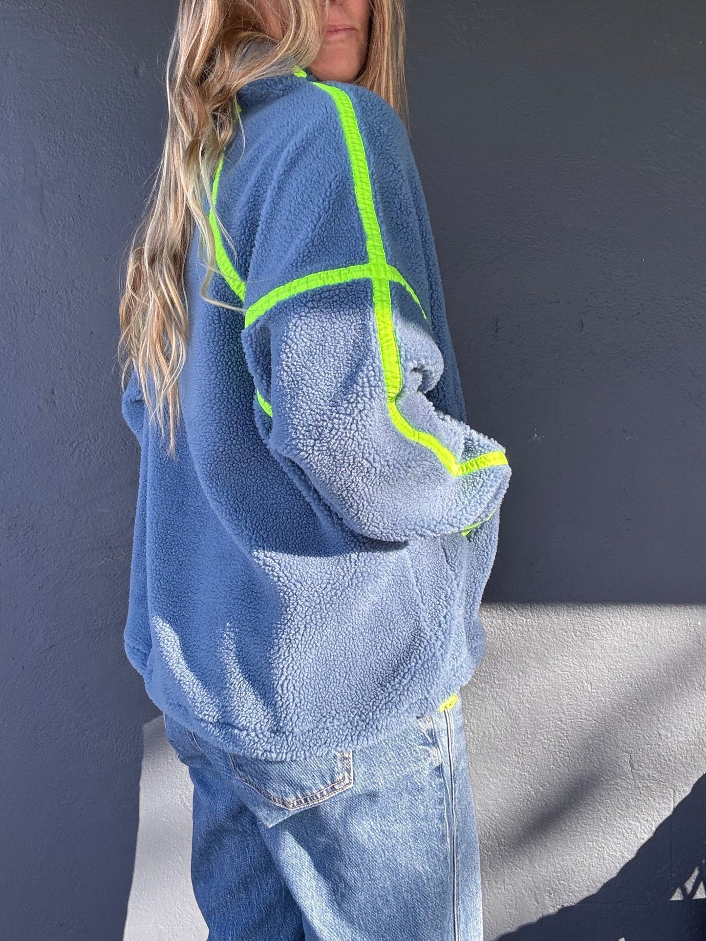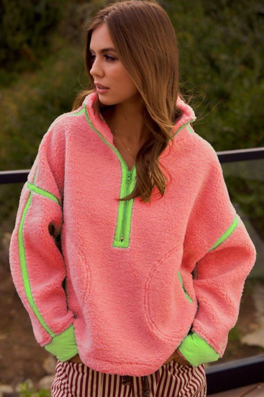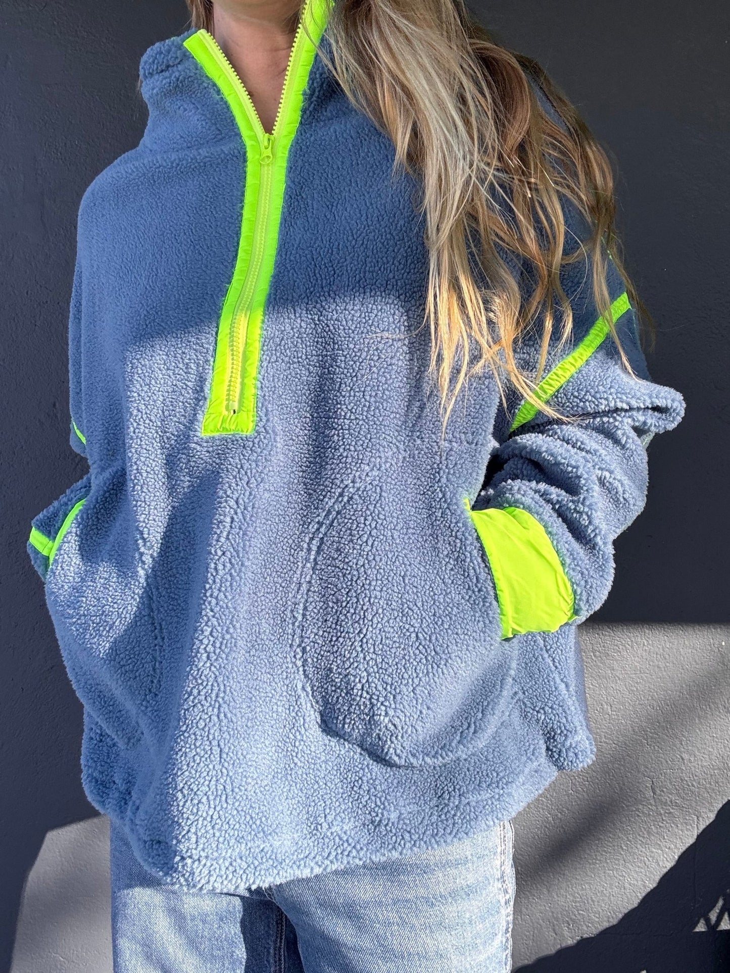 Stay cozy and stylish with the Zip & Chill Fleece Pullover, featuring a fun pop of color in Navy/Lime or Pink/Lime. Perfect for hiding your essentials and keeping warm on those chill days!
