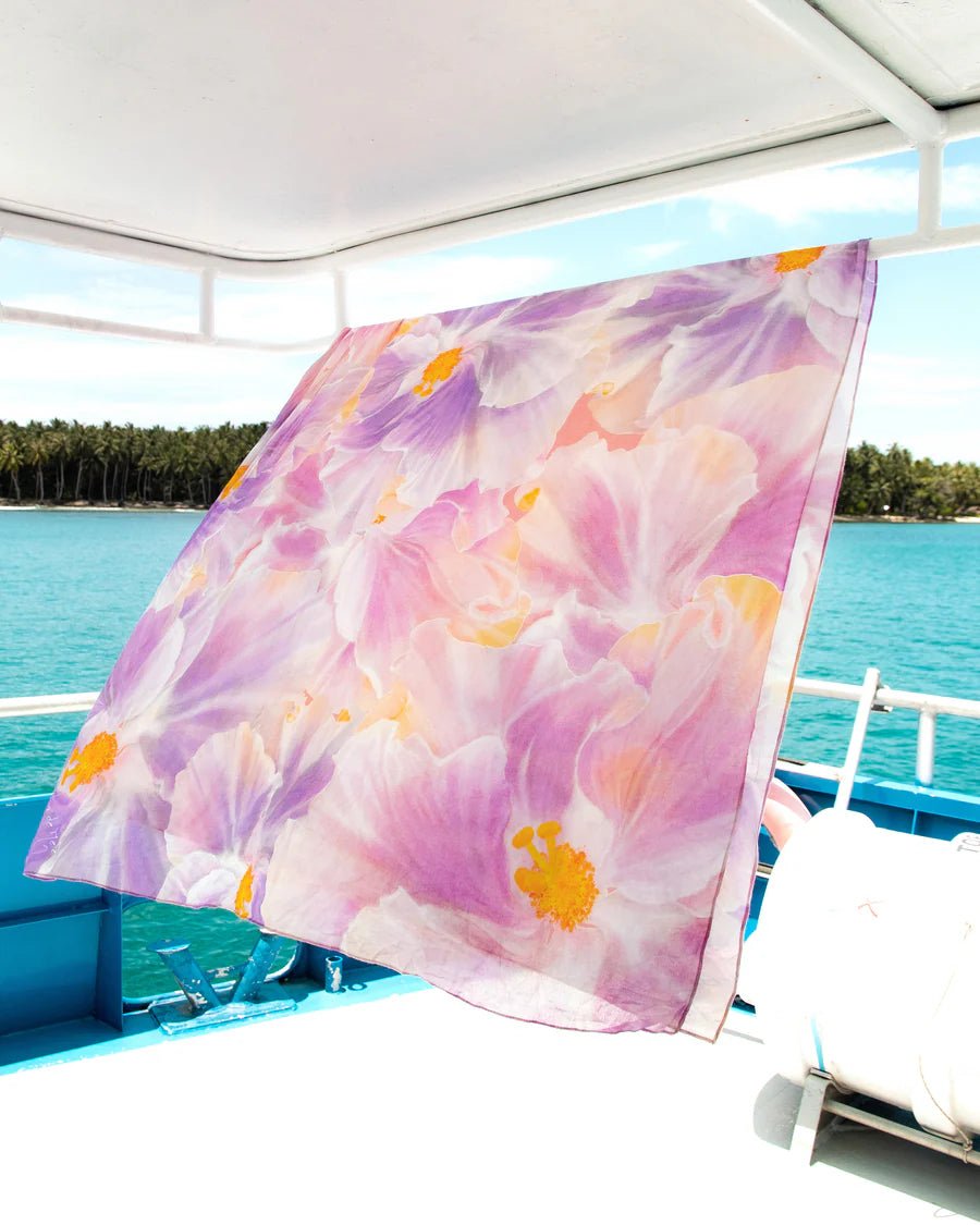 Wrap yourself in the vibrant spirit of Hawaii with the ALOHA DE MELE Pareo - Poni, a soft and eco-friendly purple wrap that doubles as a scarf or cozy throw. Featuring unique artwork by JT Ojerio, this versatile piece brings island charm wherever you go.