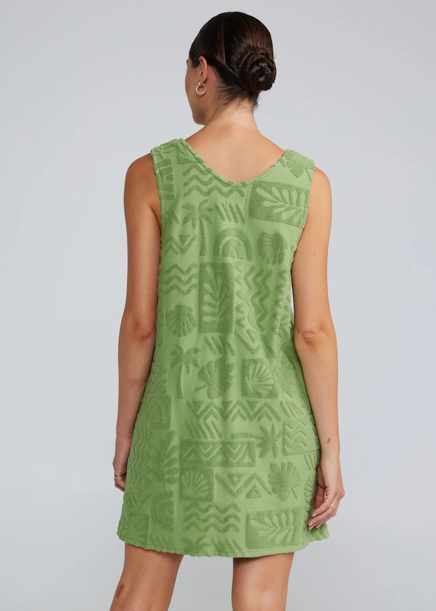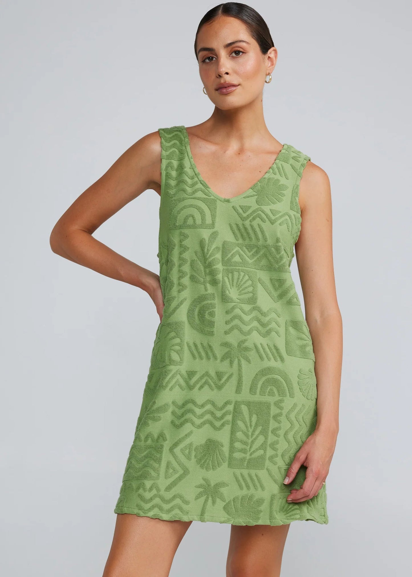 The POOLSIDE PARADISO Mai Tai V Dress in Palm brings a fresh, nature-inspired vibe to your summer wardrobe with its playful V-neck shift design. Crafted from our exclusive burnout towelling fabric, this mini dress is effortlessly cool and comfy for all your sunny adventures.