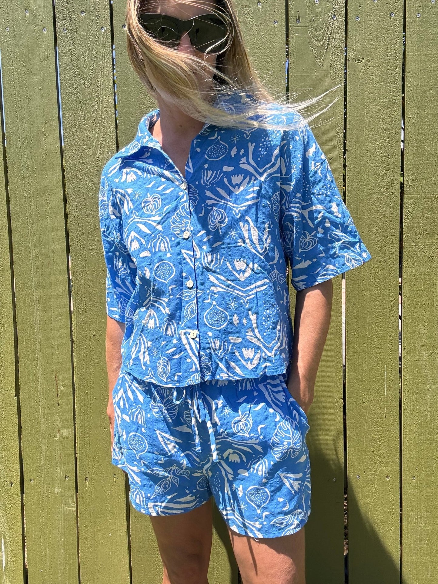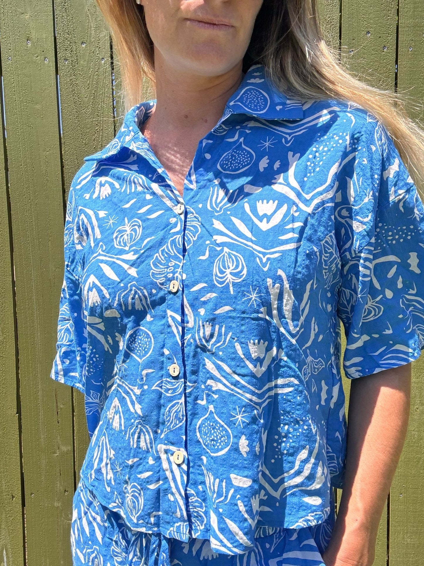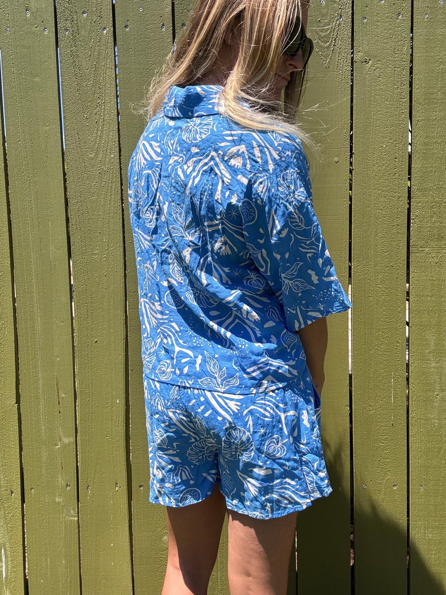 Dive into style with our Ocean Blues Shirt Top! Crafted from printed fabric, this shirt top features a coconut button down, collar, and short sleeves for a perfect fit. Complete the look with the matching shorts featuring the Ocean Blues Shorts for the perfect summer outfit!