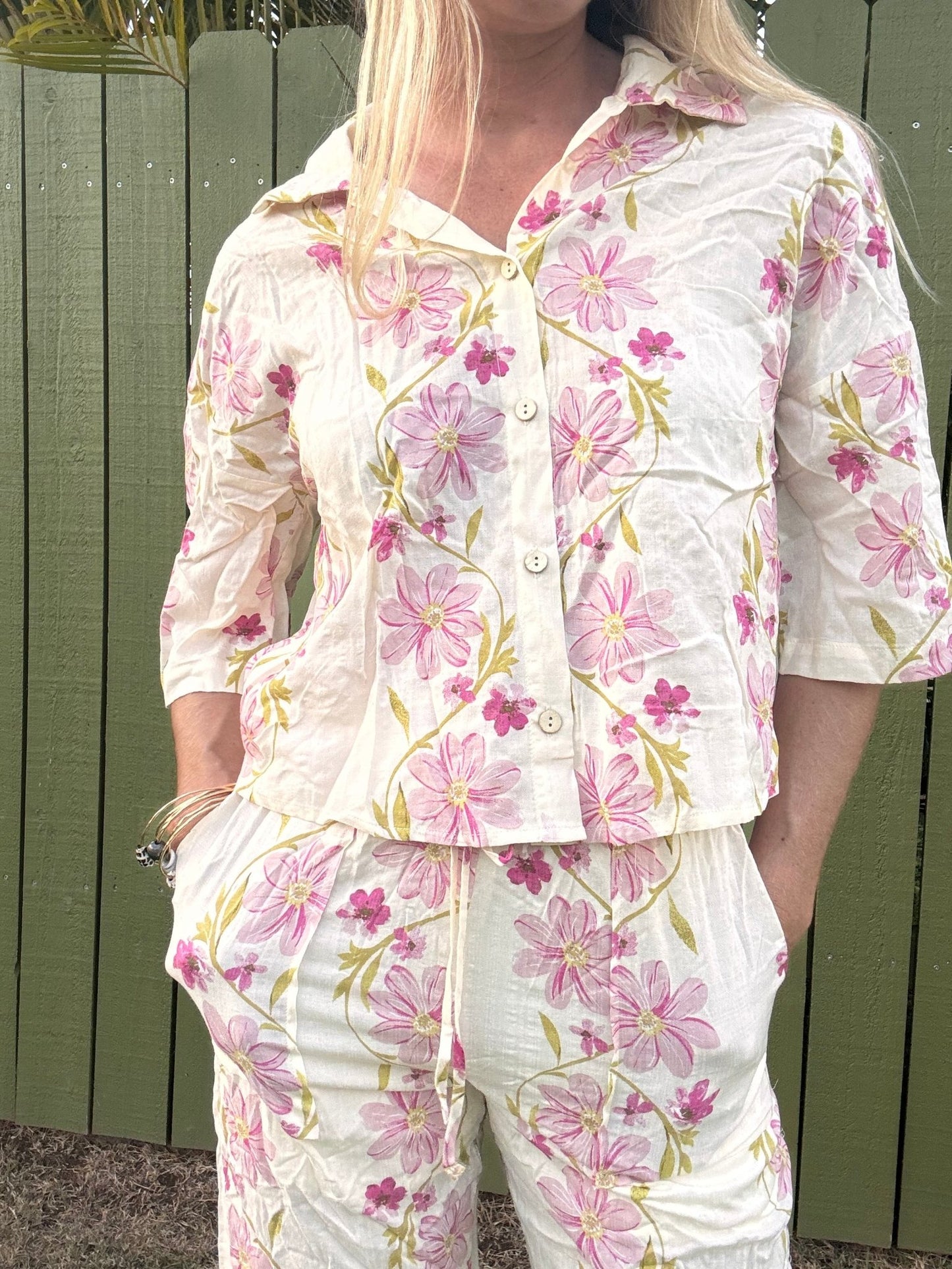 Blossom into spring with this quirky shirt top! Made with a coconut button down, collar, and short sleeves, you'll feel effortlessly stylish. Perfect for any occasion, this shirt top is as versatile as it is fun! The perfect pair with our Spring Blossom Pants!