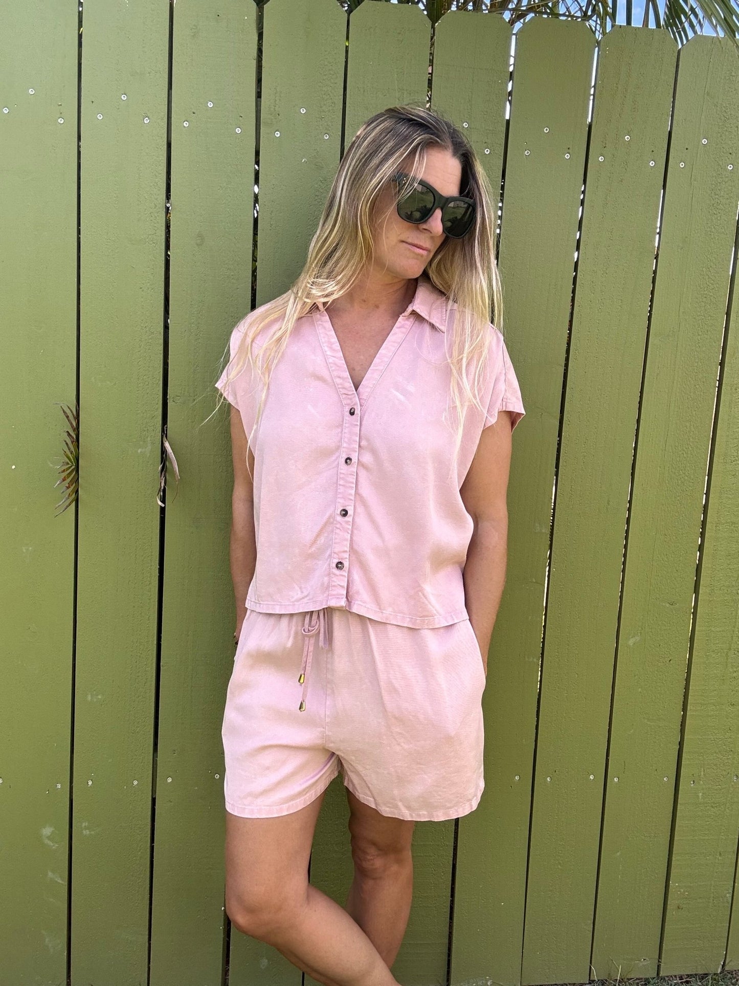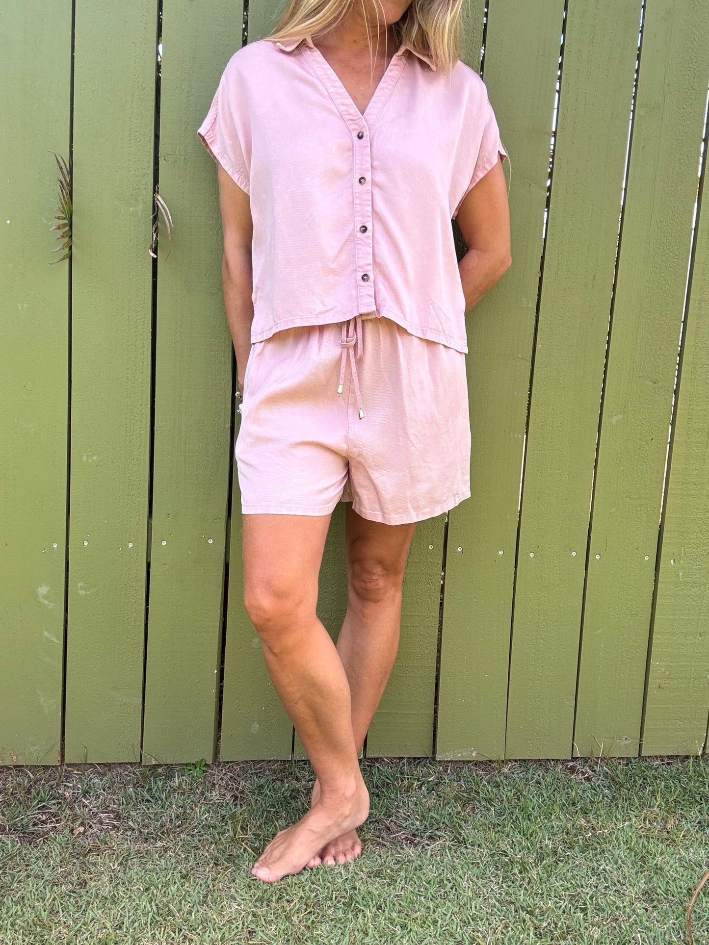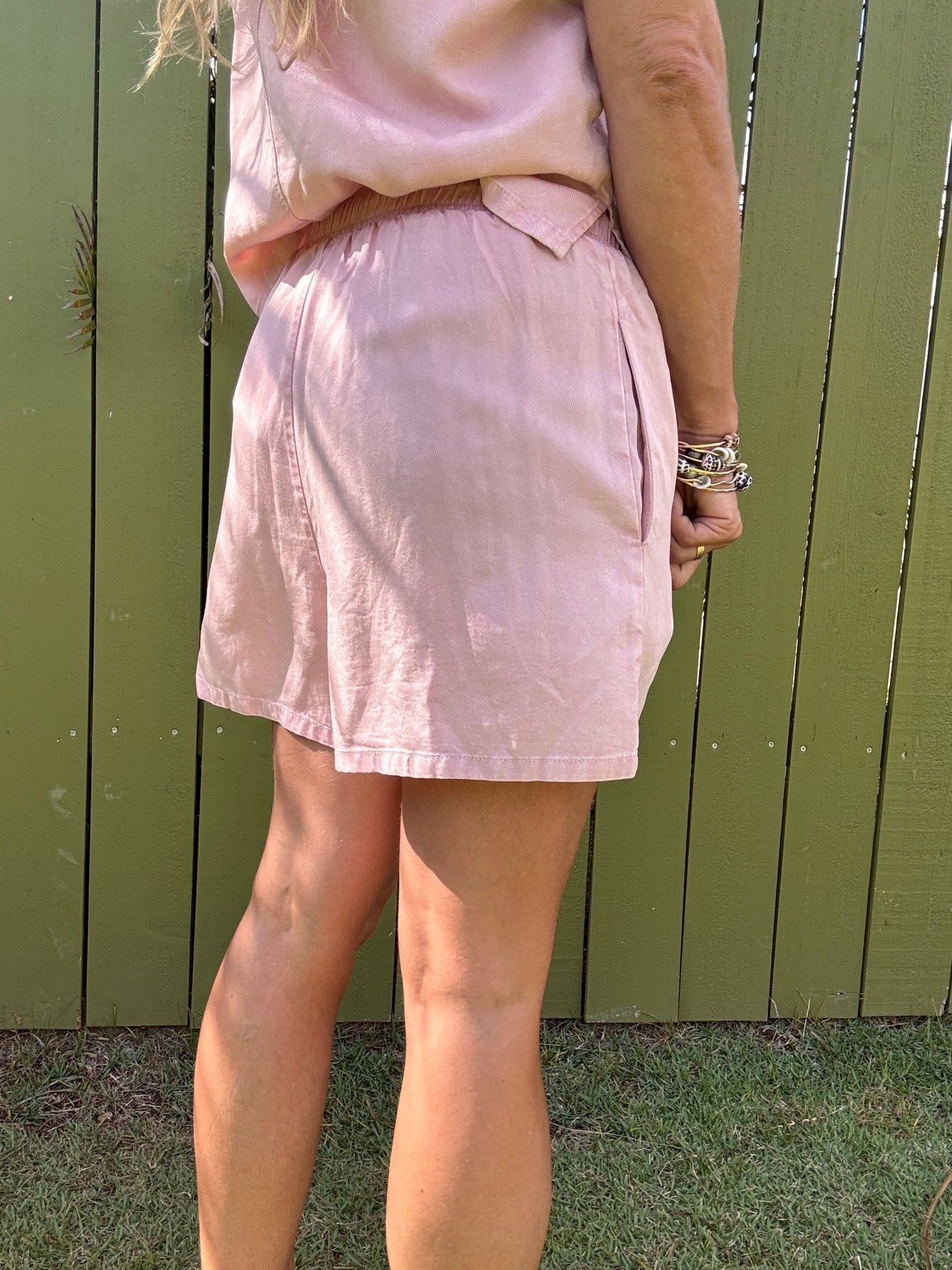 Stay cool and stylish all summer long with our Pinky Promise Shorts! Made of washed chambray and featuring an elastic waist and drawstring, these shorts are both comfortable and trendy. Plus, with convenient side pockets, you'll always have a place to keep your phone and keys. In a light pink color, these shorts are perfect for any casual outfit!