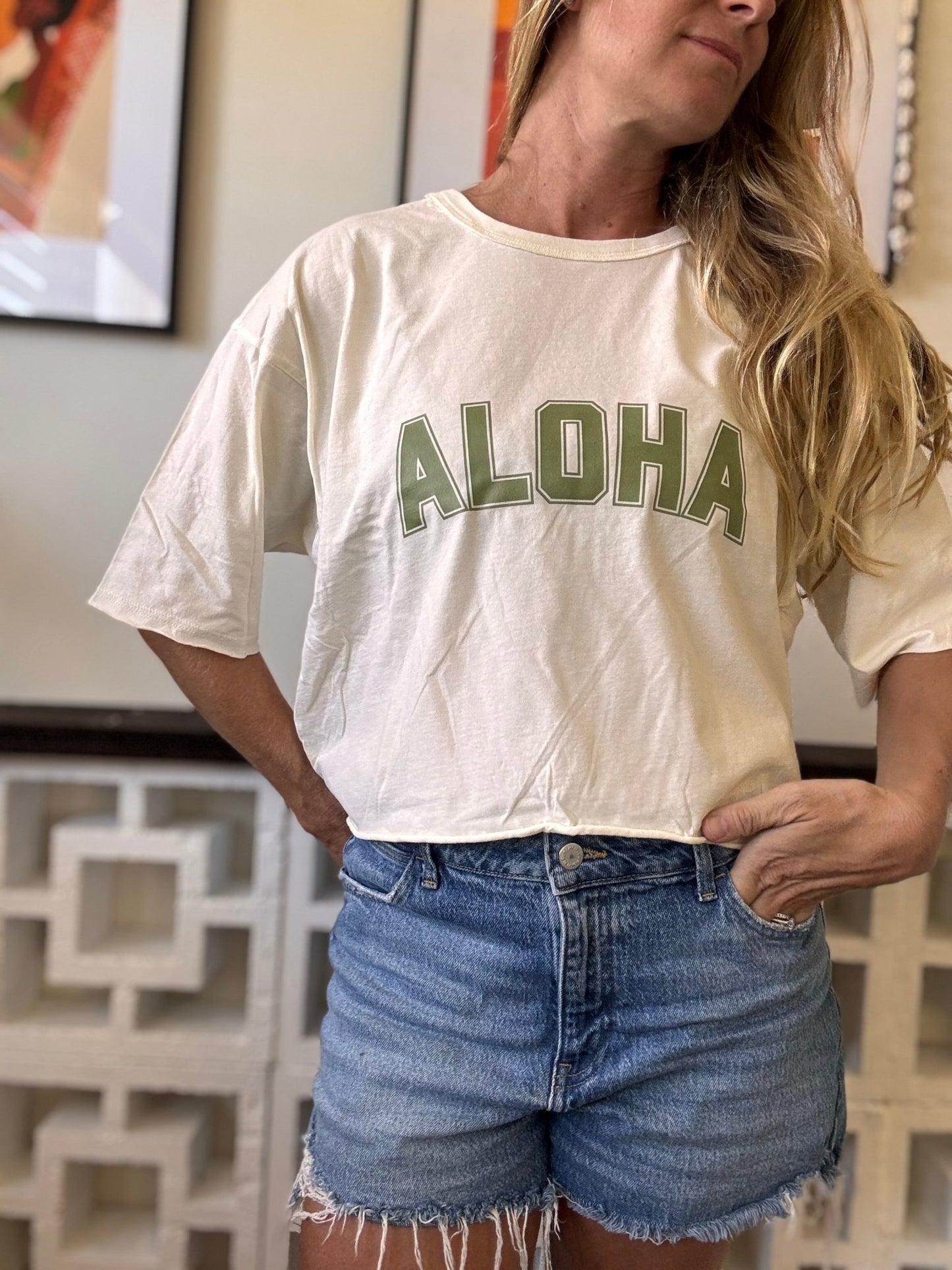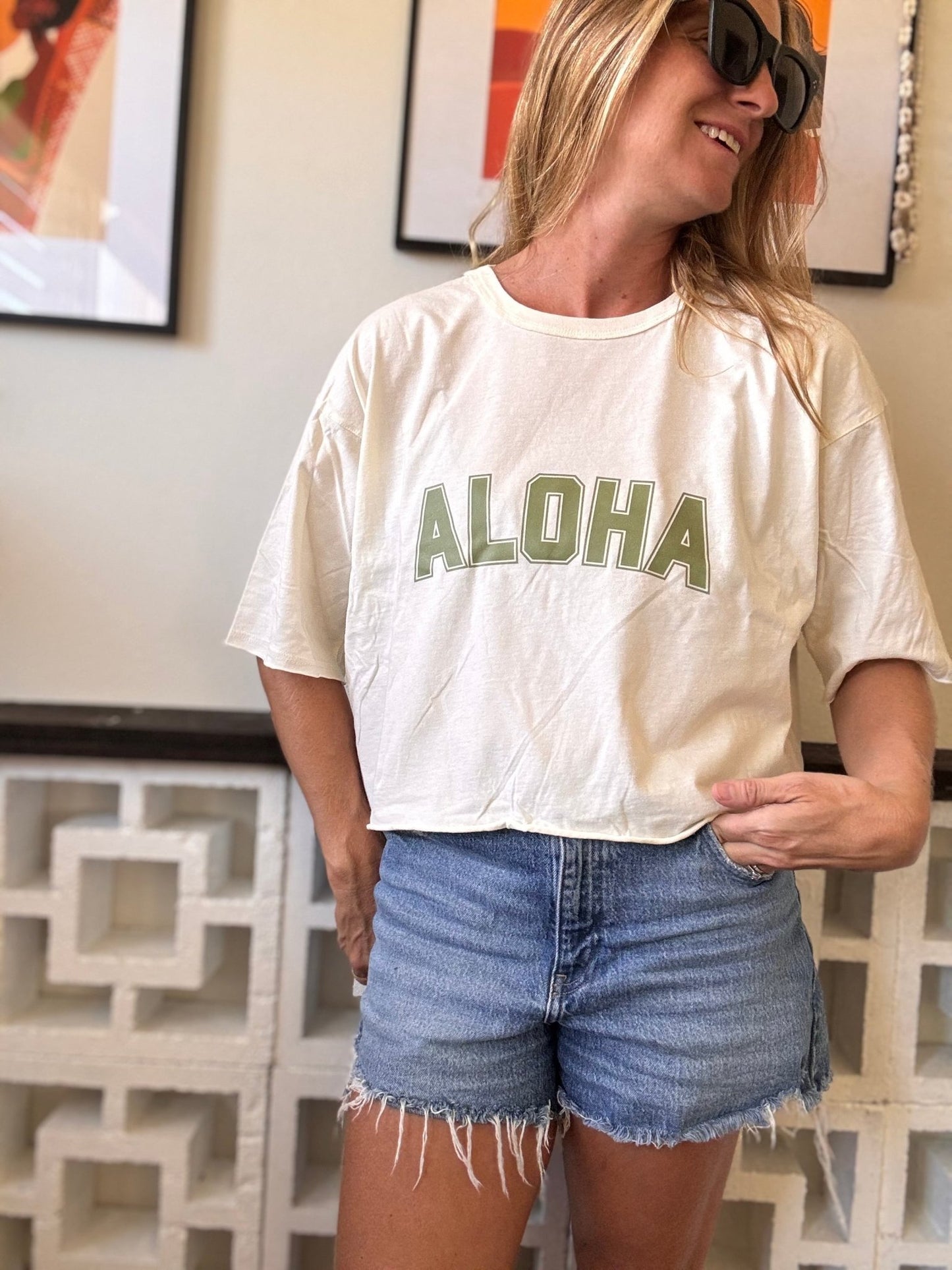 College of Aloha Distressed Cropped Tee-Ivory/Olive