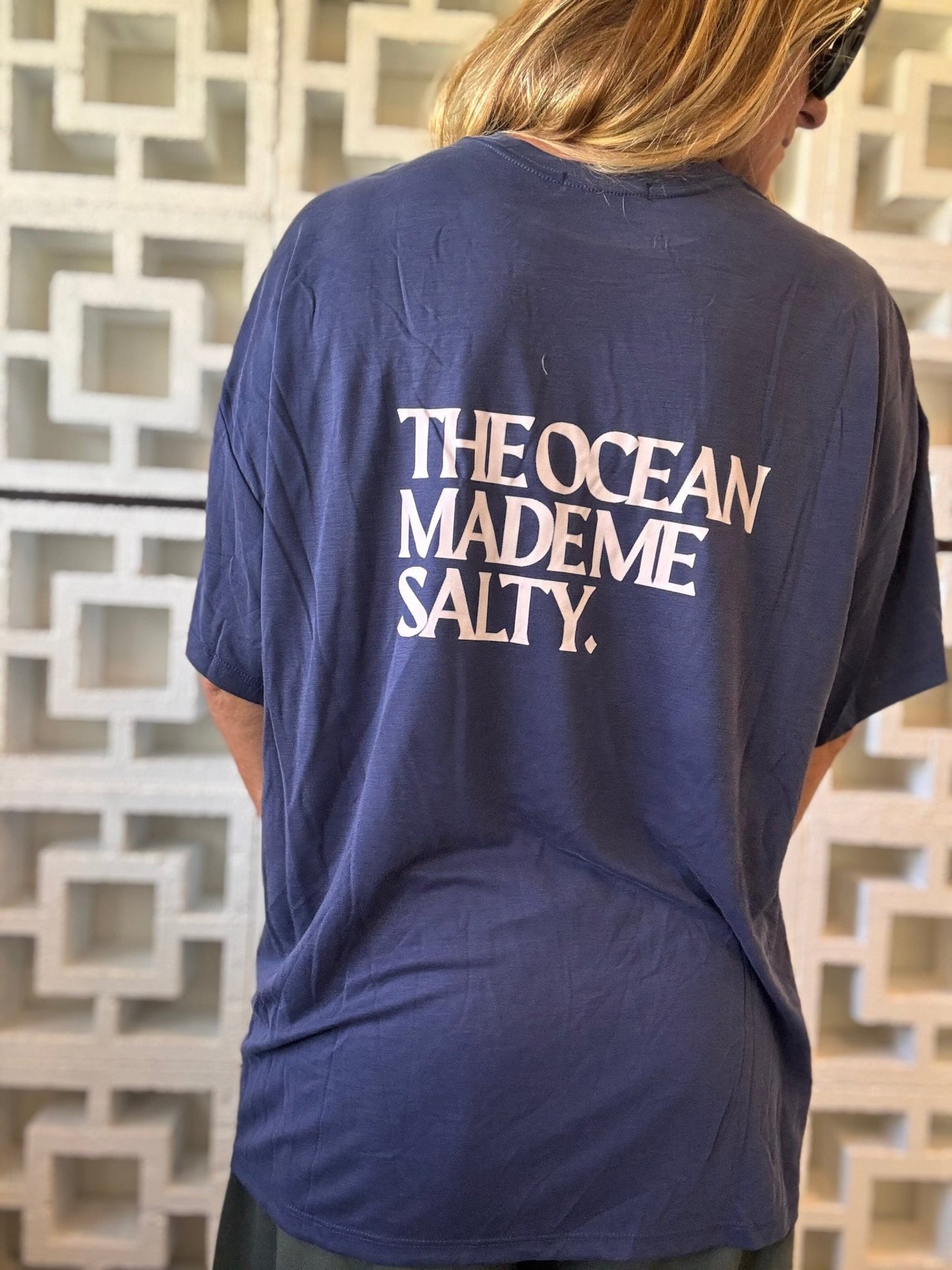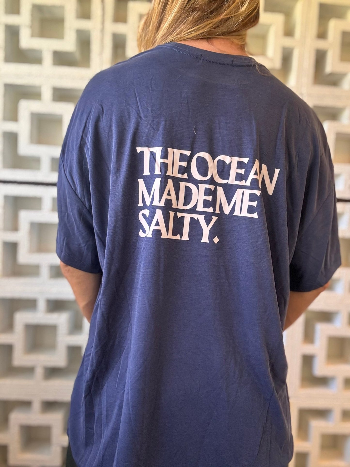 Slip into effortless island vibes with this oversized tee featuring a drapey, buttery-soft fabric that feels as good as it looks. The back showcases a cheeky "Ocean Made Me Salty" graphic that perfectly captures your coastal state of mind. It's the ultimate laid-back layer for beach days, casual hangouts, or whenever you need to channel your inner beach babe.