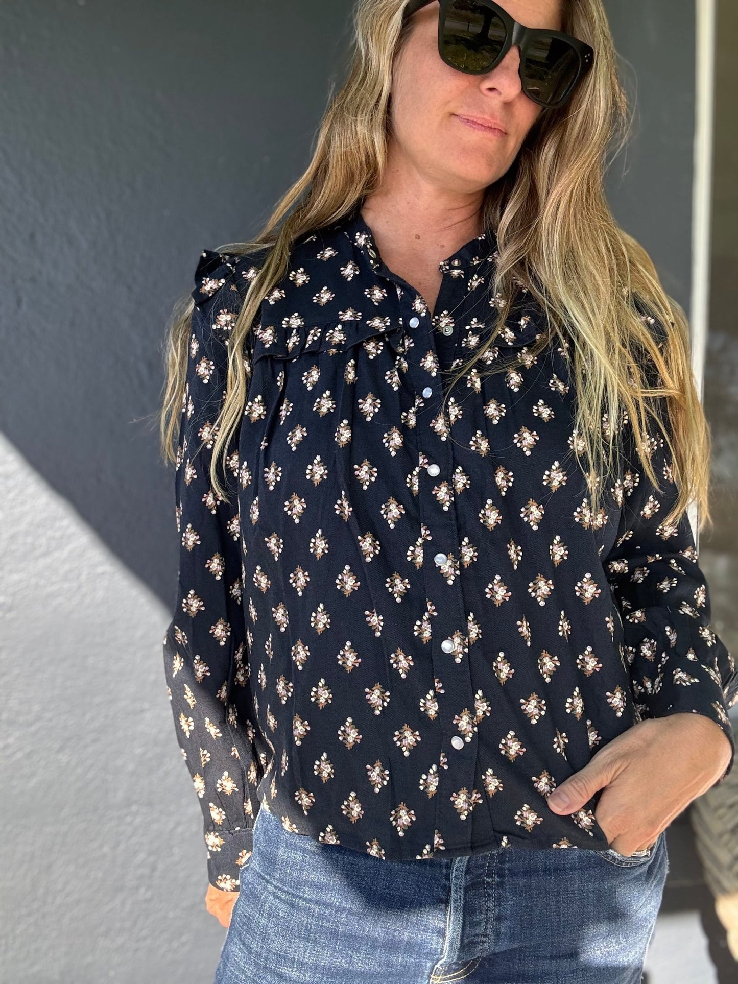 Add a flirty twist to your wardrobe with the LEVIS Gianna Long Sleeve Blouse in Yulia Floral, featuring charming ruffle trim and a classic button-up design. Perfect for adding a touch of fun and elegance to any outfit!