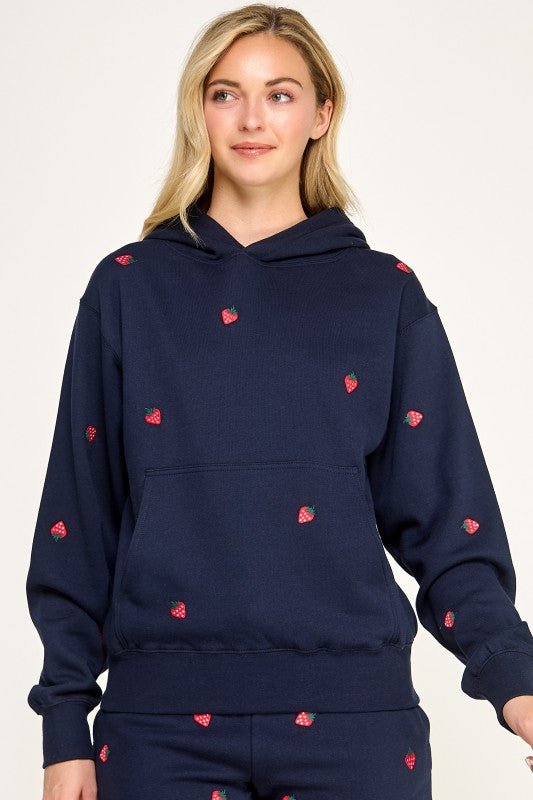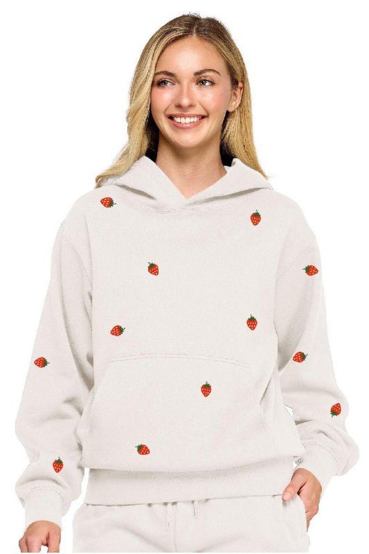 Wrap yourself in cozy comfort with our Berry Babe Hoodie, featuring adorable strawberry embroidery that's as sweet as you are. This relaxed-fit pullover is your new go-to for effortless style that feels like a warm hug.
