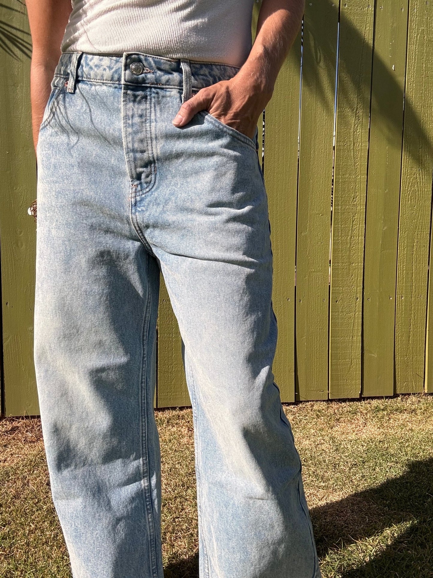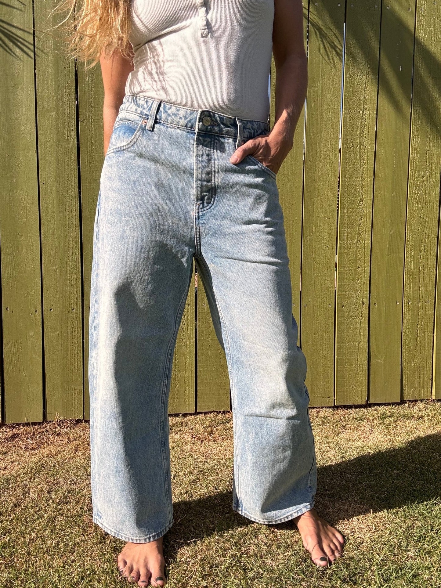 Features: Button-fly closure, five-pocket design, premium rigid denim, ankle-length inseam