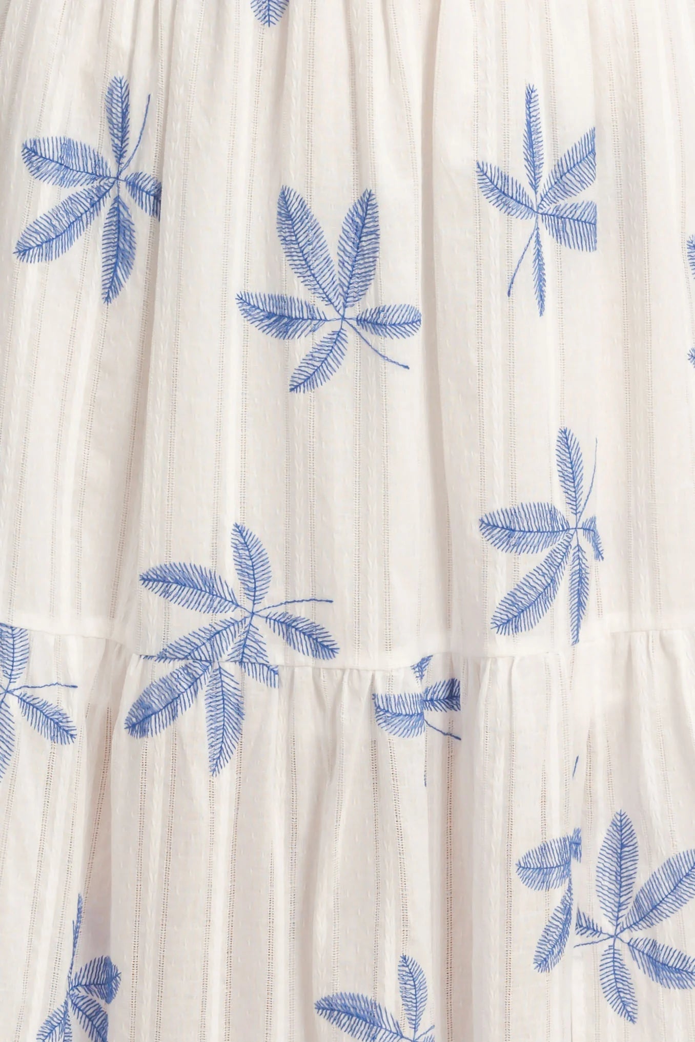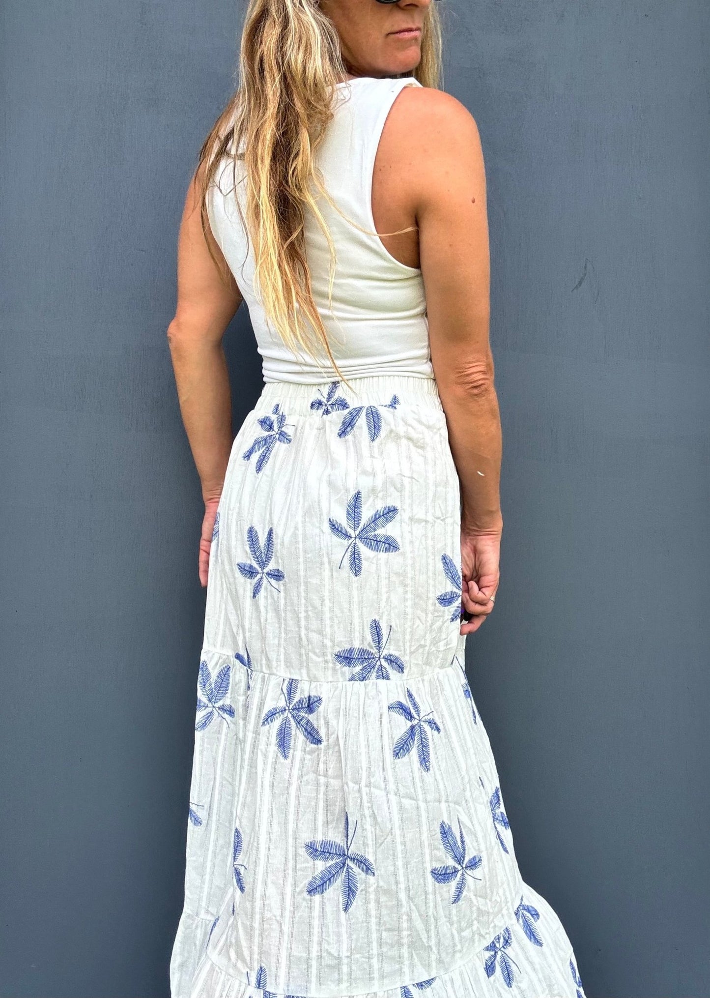 Effortlessly elegant, the Island Palm Maxi Skirt combines a flowing tiered silhouette with a vibrant blue botanical print for a fresh, sophisticated look. The comfortable elastic waistband and convenient side slit make it perfect for warm-weather styling with ease.