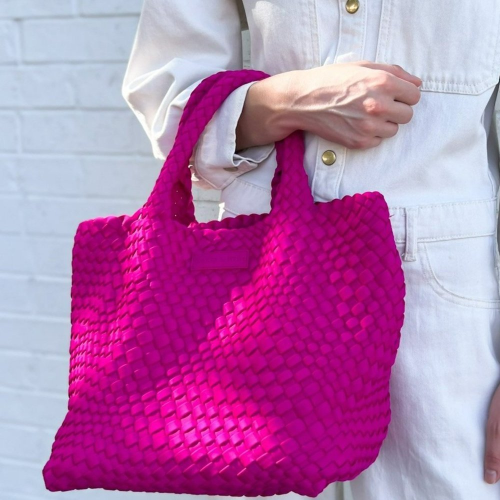 Our most popular classic woven totes are handwoven with a lycra blend and contrasting weave. Each tote comes with a matching pouch and detachable strap to transform your tote into a crossbody!