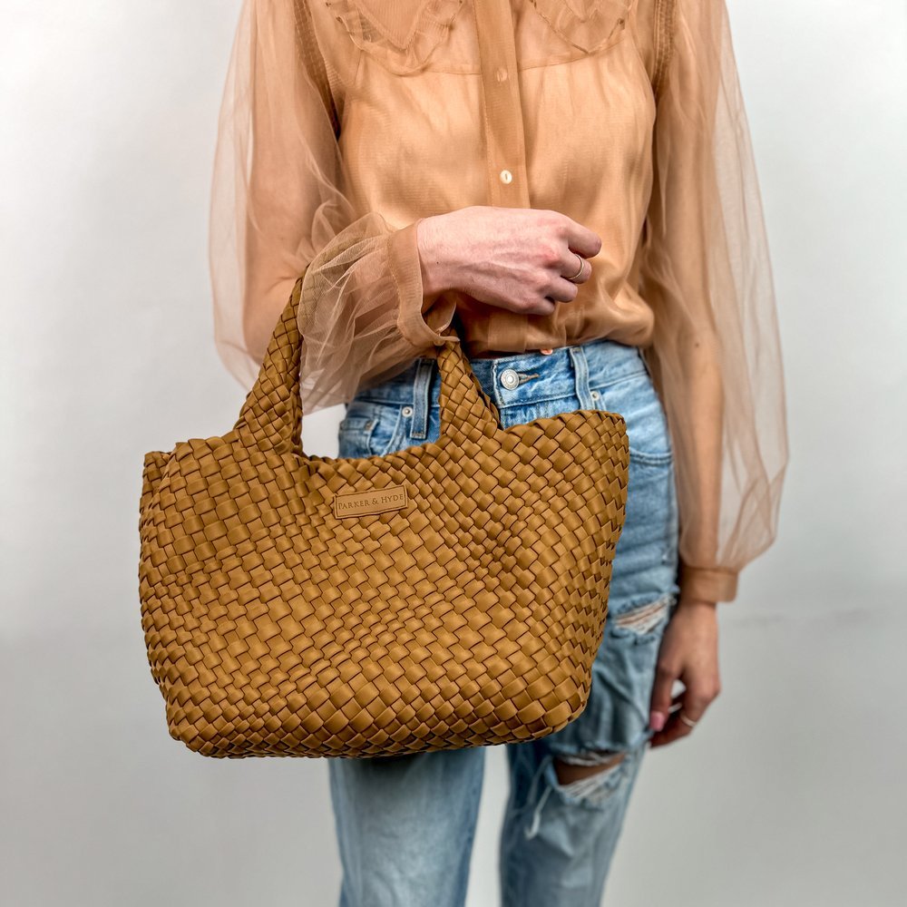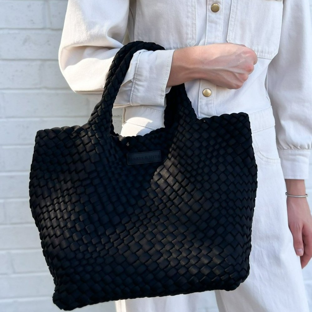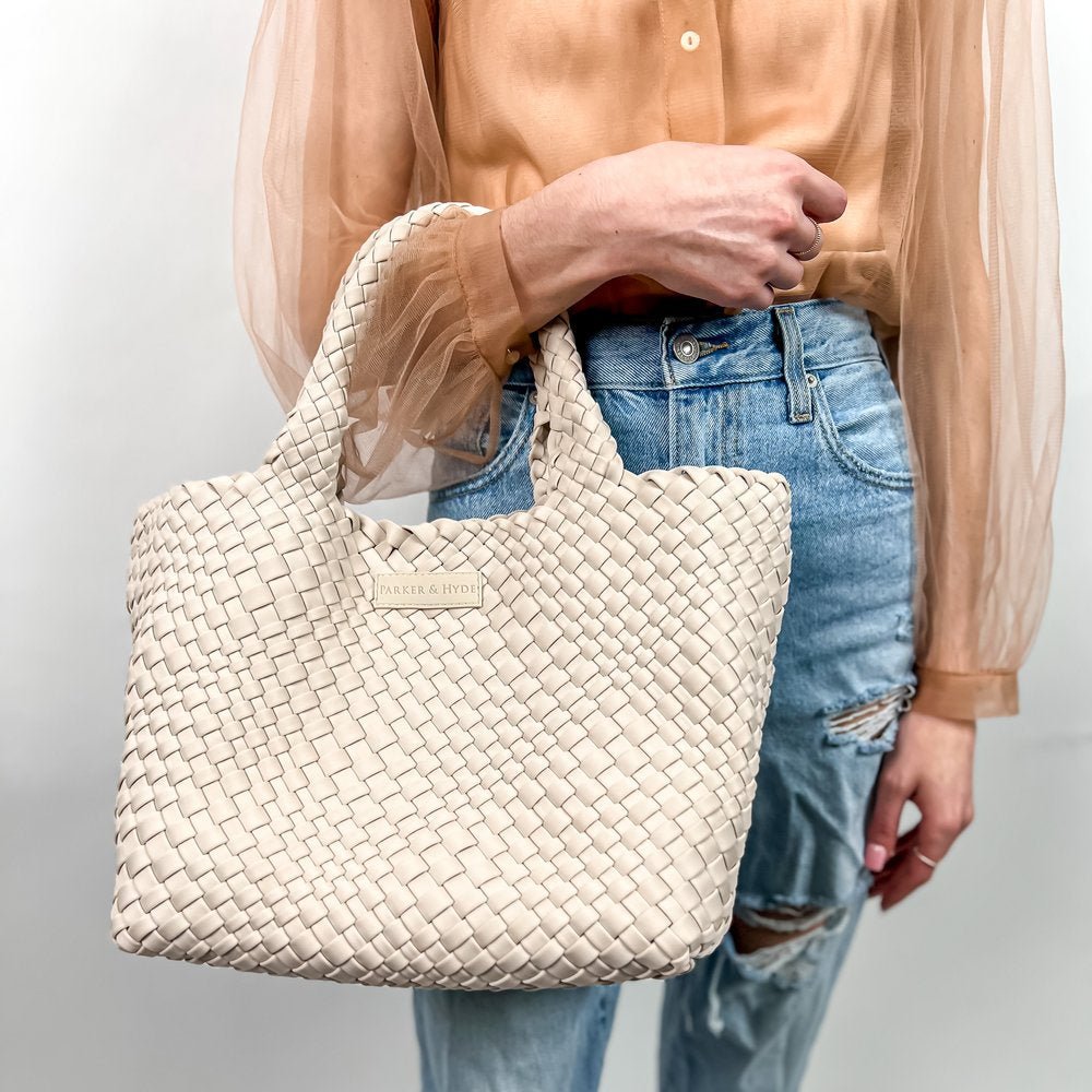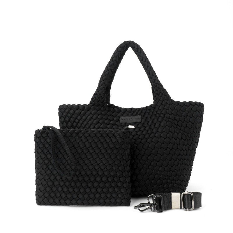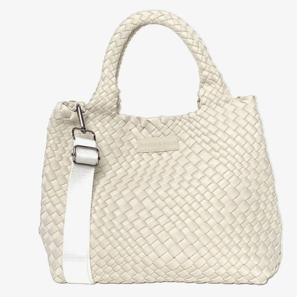 Our most popular woven totes are handwoven with a lycra blend and contrasting weave. Each tote comes with a matching pouch and detachable strap to transform your tote into a crossbody!