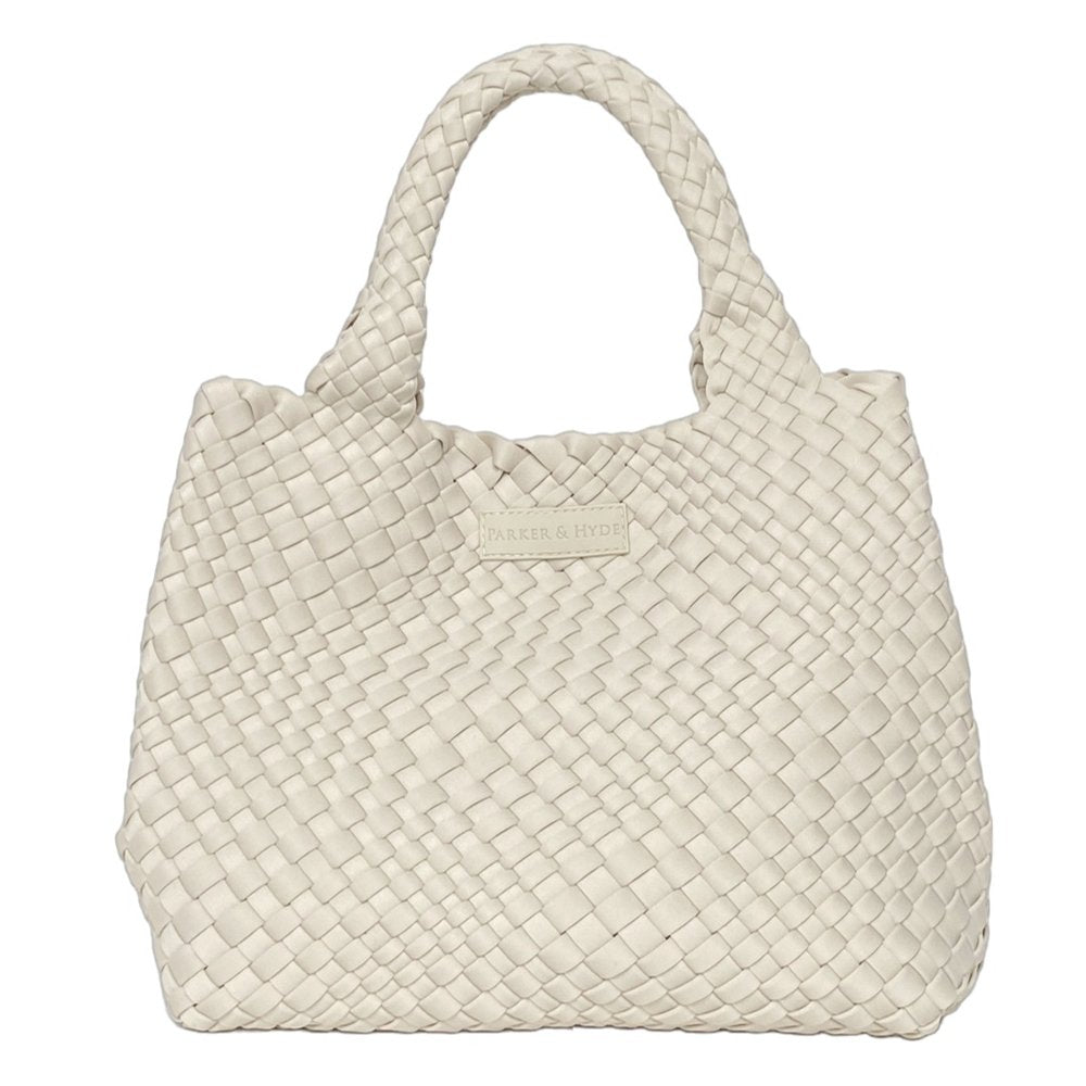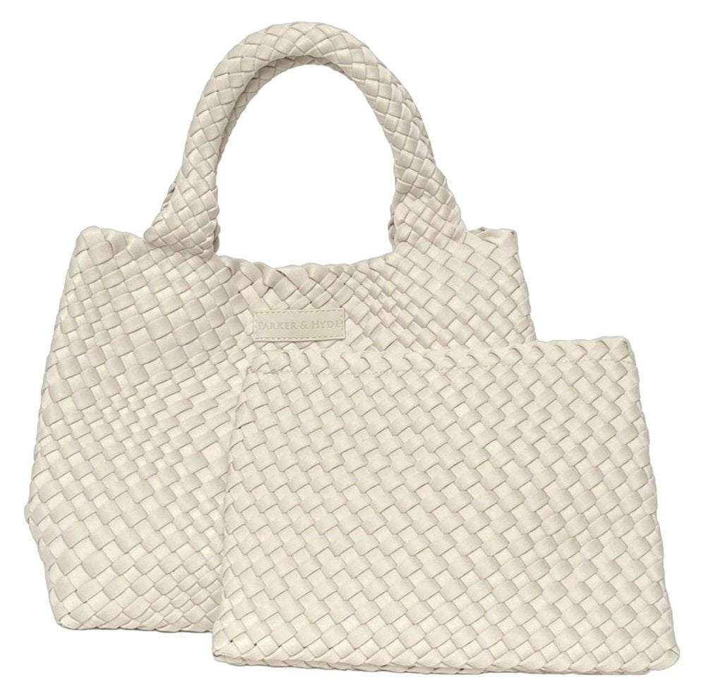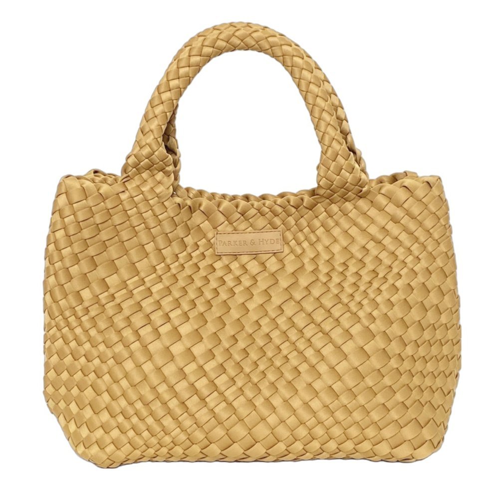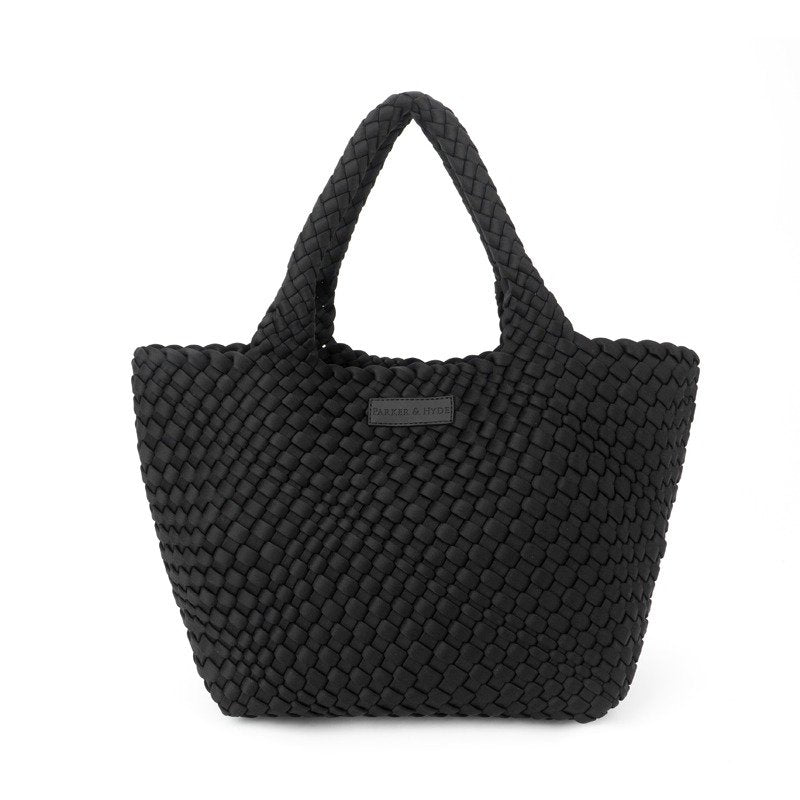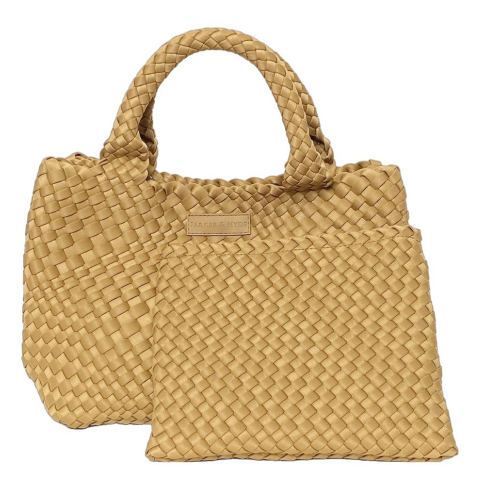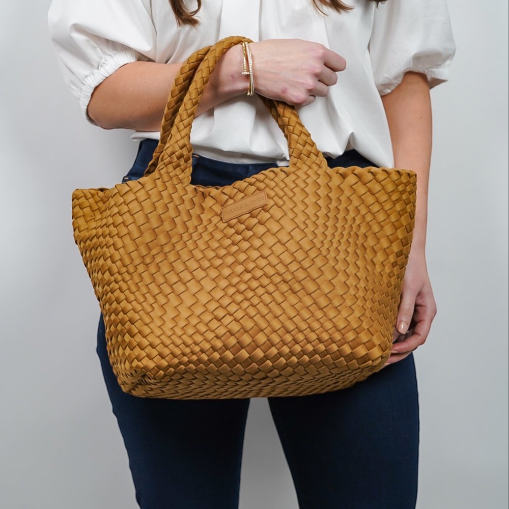 Our most popular woven totes are handwoven with a lycra blend and contrasting weave. Each tote comes with a matching pouch and detachable strap to transform your tote into a crossbody!