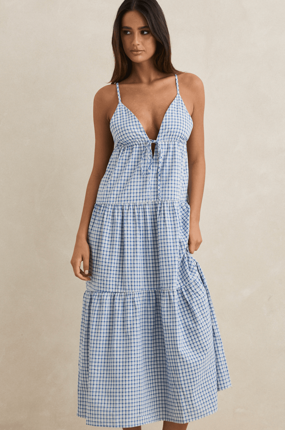 Slip into effortless coastal vibes with the Jaci Maxi Dress in Blue—a flowy stunner that hugs you in all the right places. Adjust the front tie to find your perfect fit and let the full, sweeping hem do the twirling.