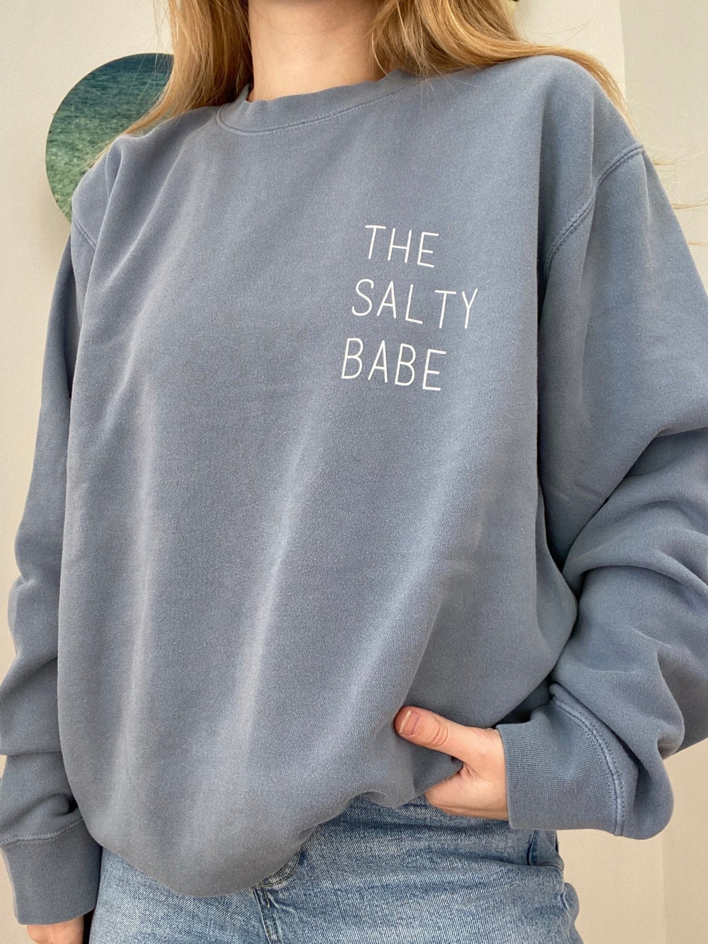 Throw on the Wave Crewneck and head for waves and warmer weather. This sweatshirt features Salty Babe lettering and a large wave graphic on the back, so you can wear your love of the ocean whether you're out on the coast or lounging at home.