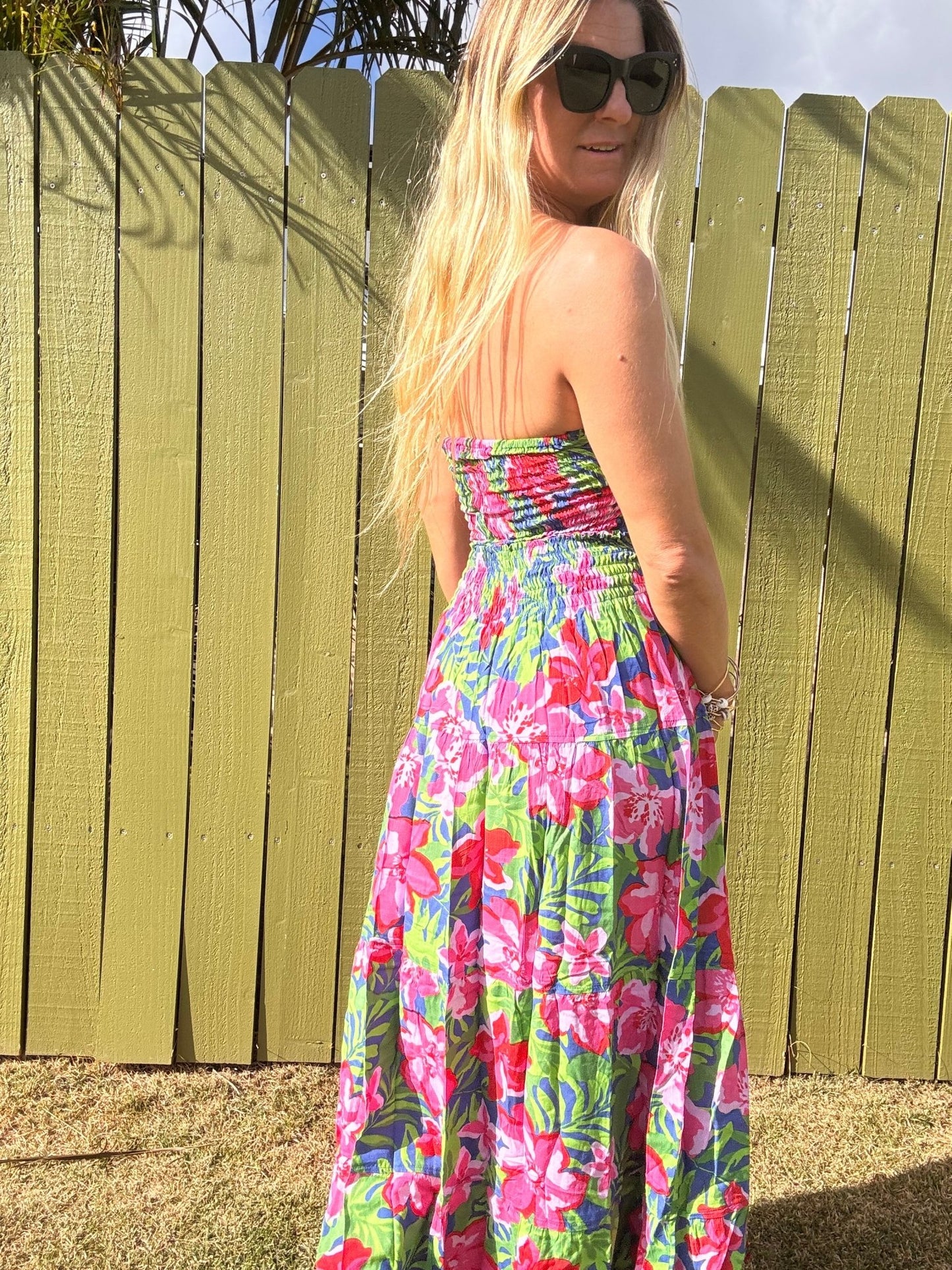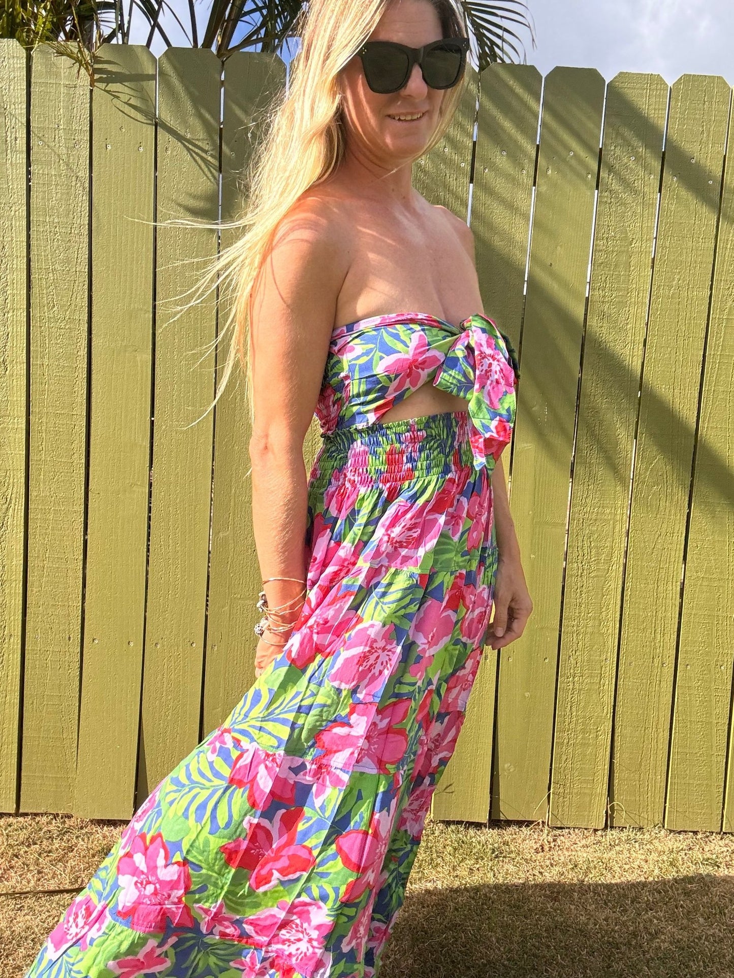 - Features: Elastic waistband and strapless self tie bodice, Tiered maxi skirt, Front cut-out detail, Smocked detail on back for adjustable fit